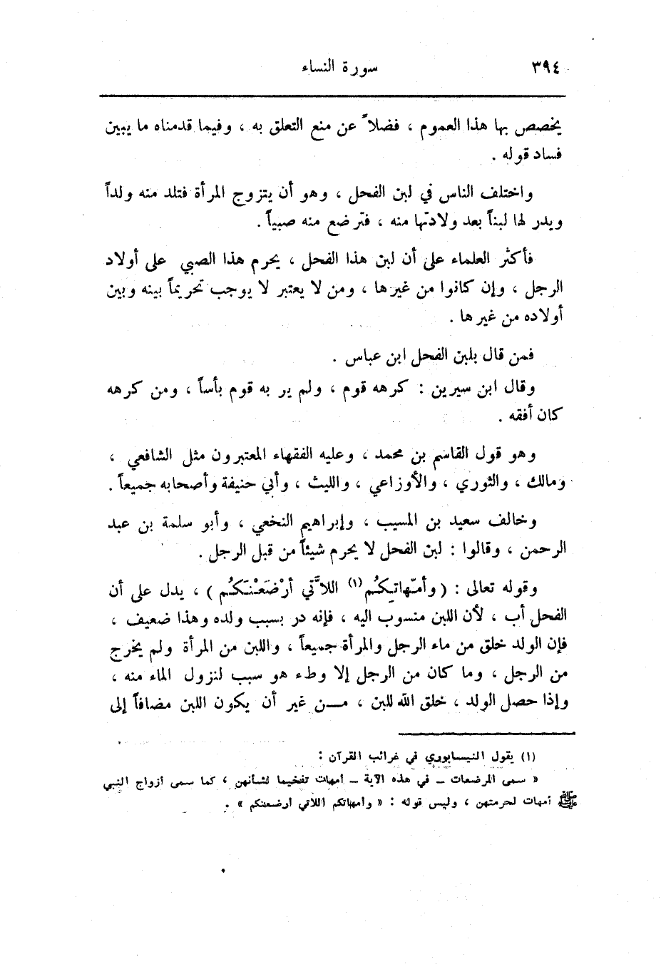 وقوله تعالى: (وَأُمَّهاتُكُمُ «1» اللَّاتِي أَرْضَعْنَكُمْ) ، يدل على أن الفحل أب، لأن اللبن منسوب اليه، فإنه در بسبب ولده وهذا ضعيف، فإن الولد خلق من ماء الرجل والمرأة جميعا، واللبن من المرأة ولم يخرج من الرجل، وما كان من الرجل إلا وطء هو سبب لنزول الماء منه، وإذا حصل الولد، خلق الله للبن، من غير أن يكون اللبن مضافا إلى