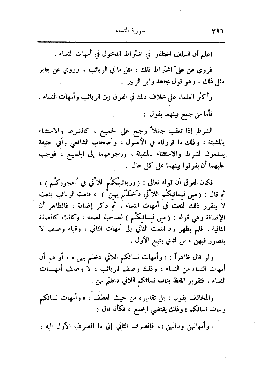 والمخالف يقول: بل تقديره من حيث العطف: «وأمهات نسائكم وبنات نسائكم» وذلك يقتضي الجمع، فكأنه قال: