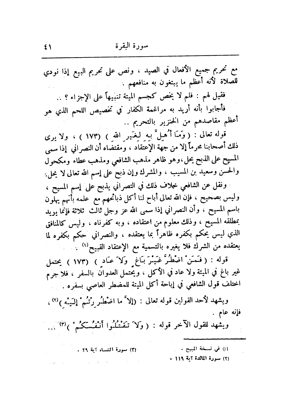 ونقل عن الشافعي خلاف ذلك في النصراني يذبح على اسم المسيح، وليس بصحيح، فإن الله تعالى أباح لنا أكل ذبائحهم مع علمه بأنهم يهلون باسم المسيح، وأن النصراني إذا سمى الله عز وجل ثالث ثلاثة فإنما يريد بمطلقه المسيح، وذلك معلوم من اعتقاده، وبه كفرناه، وليس كالمنافق الذي ليس يحكم بكفره ظاهرا بما يعتقده، والنصراني حكم بكفره لما يعتقده من الشرك فلا يغيره بالتسمية مع الإعتقاد القبيح «1» .