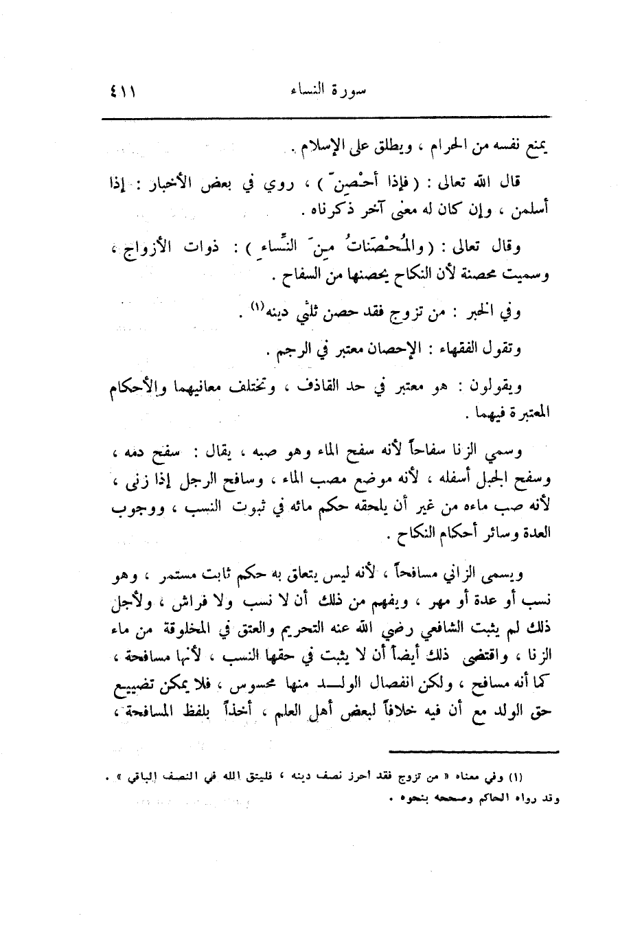 وقال تعالى: (وَالْمُحْصَناتُ مِنَ النِّساءِ) : ذوات الأزواج، وسميت محصنة لأن النكاح يحصنها من السفاح.