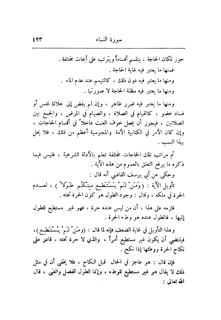 تأويل الآية: (وَمَنْ لَمْ يَسْتَطِعْ مِنْكُمْ طَوْلًا) ، لعدم الحرة في ملكه، وقال: وجود الطول هو كون الحرة تحته.