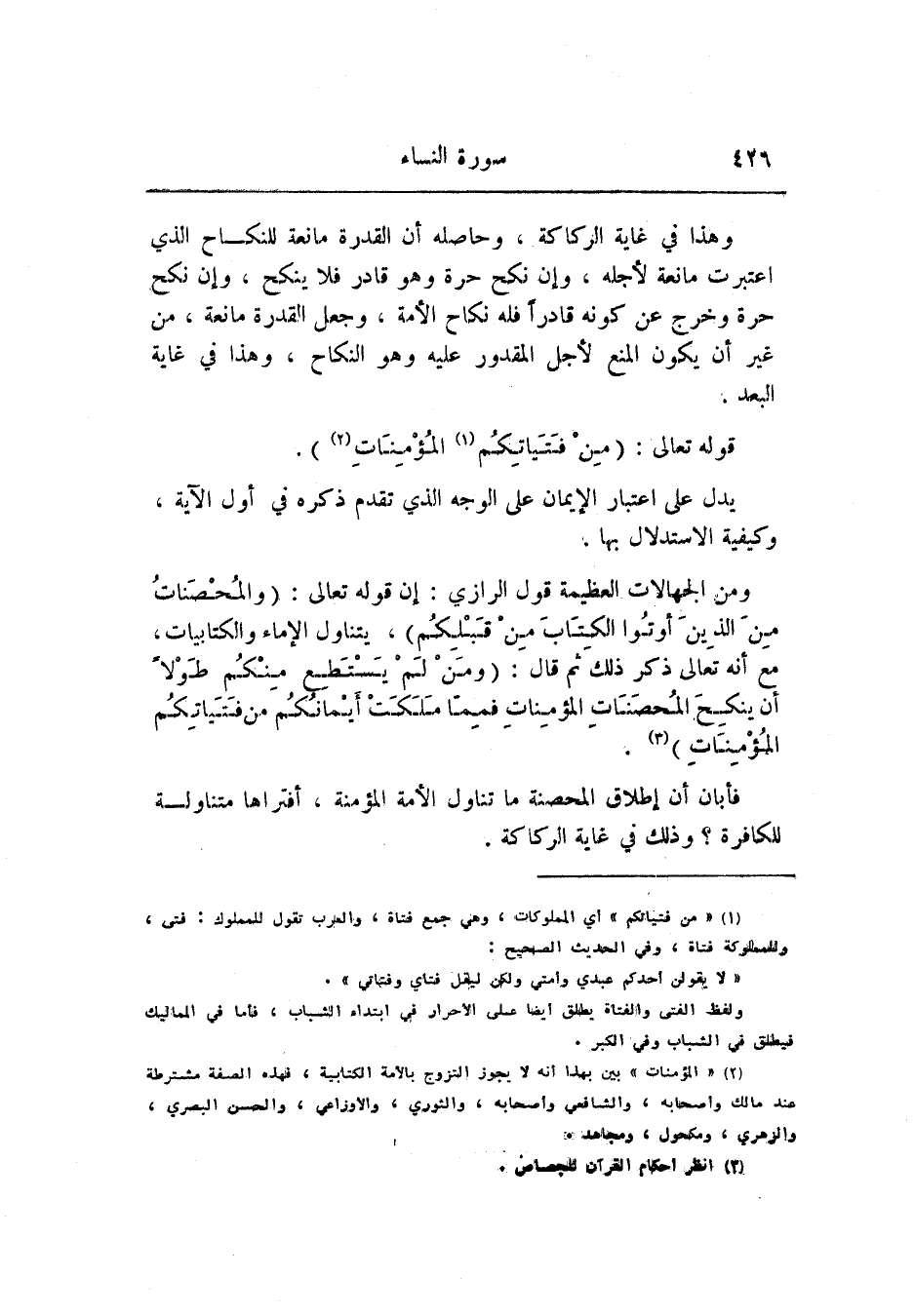 ومن الجهالات العظيمة قول الرازي: إن قوله تعالى: (وَالْمُحْصَناتُ مِنَ الَّذِينَ أُوتُوا الْكِتابَ مِنْ قَبْلِكُمْ) ، يتناول الإماء والكتابيات، مع أنه تعالى ذكر ذلك ثم قال: (وَمَنْ لَمْ يَسْتَطِعْ مِنْكُمْ طَوْلًا أَنْ يَنْكِحَ الْمُحْصَناتِ الْمُؤْمِناتِ فَمِنْ ما مَلَكَتْ أَيْمانُكُمْ مِنْ فَتَياتِكُمُ الْمُؤْمِناتِ) «3» .