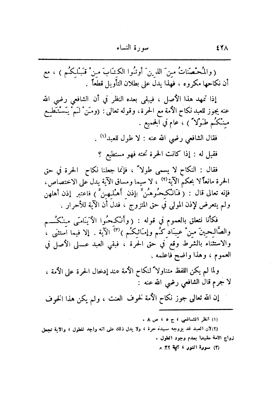 إذا تمهد هذا الأصل، فيبقى بعده النظر في أن الشافعي رضي الله عنه يجوز للعبد نكاح الأمة مع الحرة، وقوله تعالى: (وَمَنْ لَمْ يَسْتَطِعْ مِنْكُمْ طَوْلًا) ، عام في الجميع.