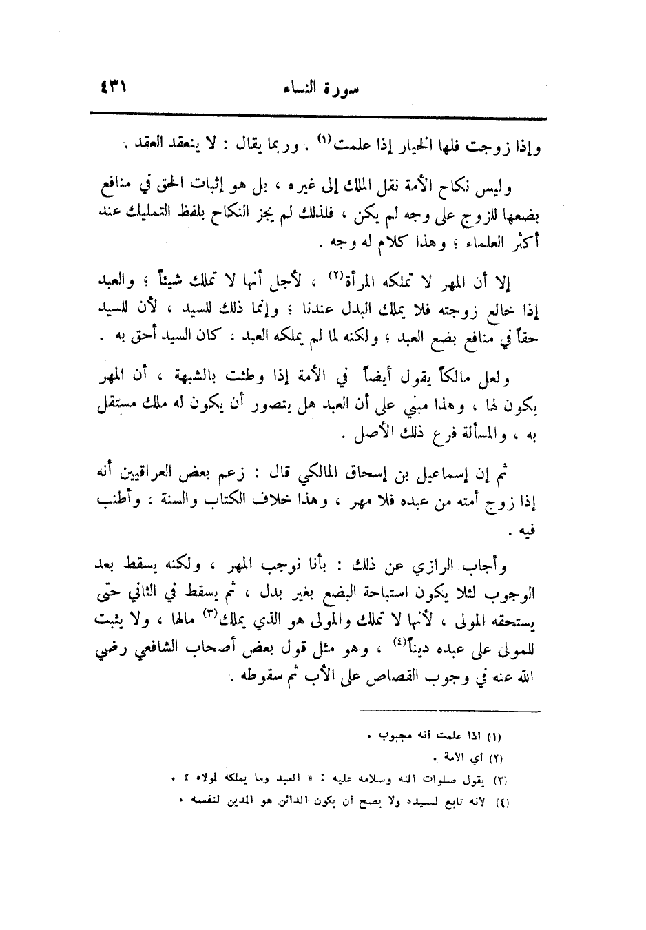 وأجاب الرازي عن ذلك: بأنا نوجب المهر، ولكنه يسقط بعد الوجوب لئلا يكون استباحة البضع بغير بدل، ثم يسقط في الثاني حتى يستحقه المولى، لأنها لا تملك والمولى هو الذي يملك «3» مالها، ولا يثبت للمولى على عبده دينا «4» ، وهو مثل قول بعض أصحاب الشافعي رضي الله عنه في وجوب القصاص على الأب ثم سقوطه.