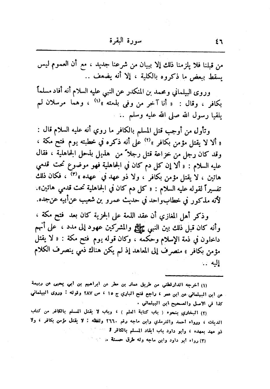 (2) البخاري بنحوه (باب كتابة العلم) ، وباب لا يقتل المسلم بالكافر من كتاب الديات، ورواه أحمد والترمذي وابن ماجة رقم 2660 ولفظه: لا يقتل مؤمن بكافر، ولا ذو عهد بعهده، وأبو داود باب أيقاد المسلم بالكافر؟