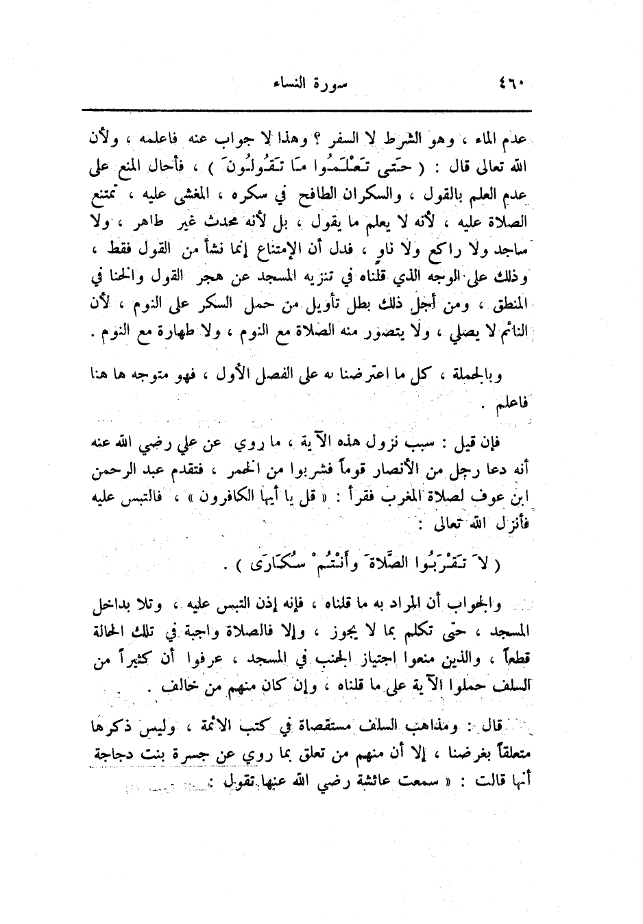 عدم الماء، وهو الشرط لا السفر؟ وهذا لا جواب عنه فاعلمه، ولأن الله تعالى قال: (حَتَّى تَعْلَمُوا ما تَقُولُونَ) ، فأحال المنع على عدم العلم بالقول، والسكران الطافح في سكره، المغشى عليه، تمتنع الصلاة، عليه، لأنه لا يعلم ما يقول، بل لأنه محدث غير طاهر، ولا ساجد ولا راكع ولا ناو، فدل أن الامتناع إنما نشأ من القول فقط، وذلك على الوجه الذي قلناه في تنزيه المسجد عن هجر القول والخنا في المنطق، ومن أجل ذلك بطل تأويل من حمل السكر على النوم، لأن النائم لا يصلي، ولا يتصور منه الصلاة مع النوم، ولا طهارة مع النوم.