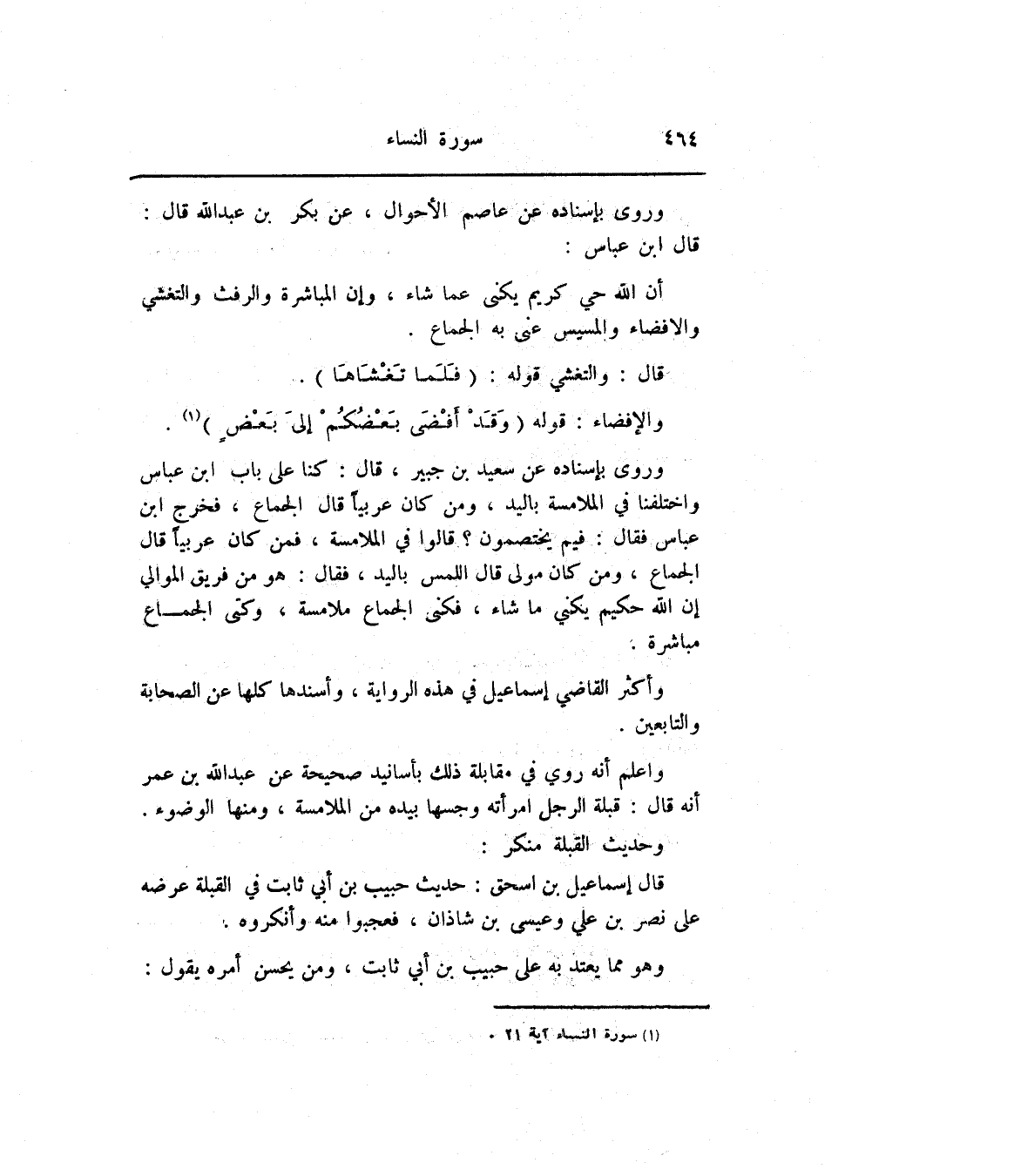 وروى بإسناده عن سعيد بن جبير، قال: كنا على باب ابن عباس واختلفنا في الملامسة باليد، ومن كان عربيا قال الجماع، فخرج ابن عباس فقال: فيم يختصمون؟ قالوا في الملامسة، فمن كان عربيا قال الجماع، ومن كان مولى قال اللمس باليد، فقال: هو من فريق الموالي إن الله حكيم يكني ما شاء، فكنى الجماع ملامسة، وكنى الجماع مباشرة.