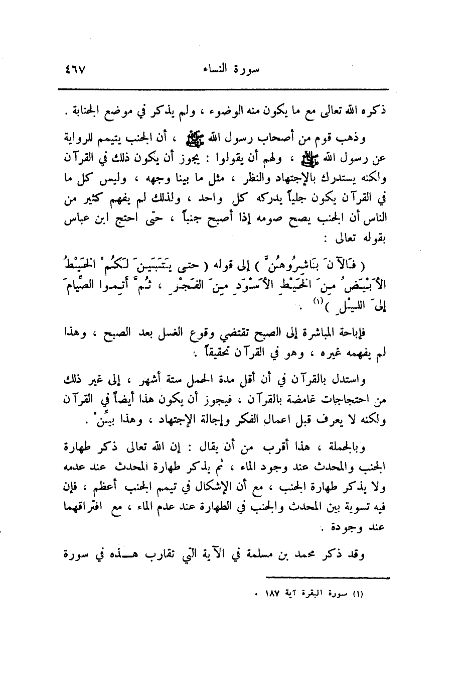 فإباحة المباشرة إلى الصبح تقتضي وقوع الغسل بعد الصبح، وهذا لم يفهمه غيره، وهو في القرآن تحقيقا.
