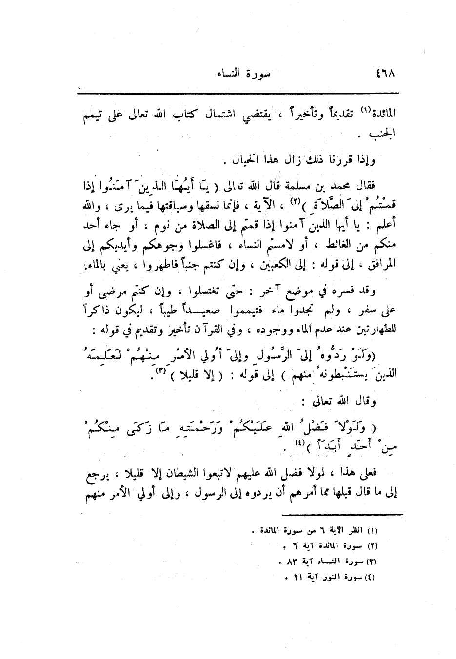 (وَلَوْ رَدُّوهُ إِلَى الرَّسُولِ وَإِلى أُولِي الْأَمْرِ مِنْهُمْ لَعَلِمَهُ الَّذِينَ يَسْتَنْبِطُونَهُ مِنْهُمْ) إلى قوله: (إِلَّا قَلِيلًا) «3» .