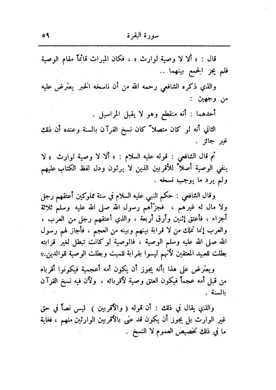 ثم قال الشافعي: قوله عليه السلام: «ألا لا وصية لوارث» لا ينفي الوصية أصلا للأقربين الذين لا يرثون ودل لفظ الكتاب عليهم ولم يرد ما يوجب نسخه.