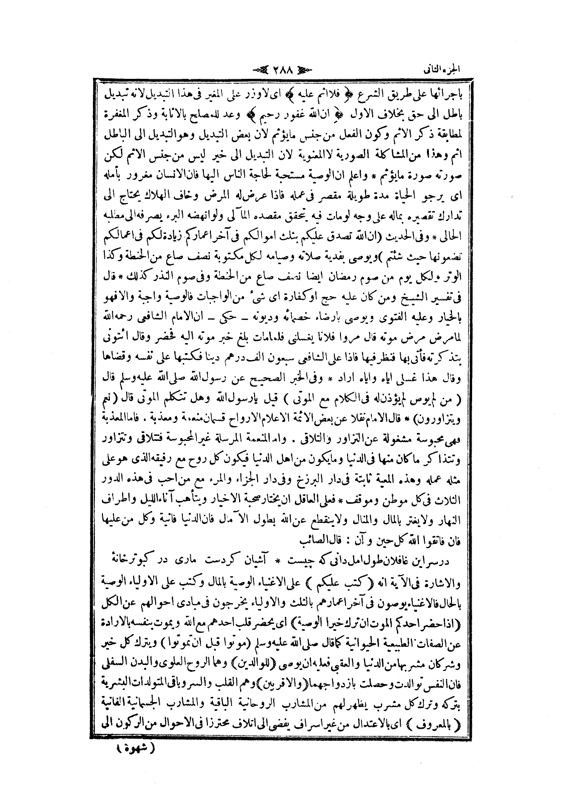 حيث شئتم) ويوصى بفدية صلاته وصيامه لكل مكتوبة نصف صاع من الحنطة وكذا الوتر ولكل يوم من صوم رمضان ايضا نصف صاع من الحنطة وفي صوم النذر كذلك قال فى تفسير الشيخ ومن كان عليه حج او كفارة اى شىء من الواجبات فالوصية واجبة والا فهو بالخيار وعليه الفتوى ويوصى بإرضاء خصمائه وديونه- حكى- ان الامام الشافعي رحمه الله لما مرض مرض موته قال مروا فلانا يغسلنى فلما مات بلغ خبر موته اليه فحضر وقال ائتوني بتذكرته فأتى بها فنظر فيها فاذا على الشافعي سبعون الف درهم دينا فكتبها على نفسه وقضاها وقال هذا غسلى إياه وإياه أراد وفي الخبر الصحيح عن رسول الله صلى الله عليه وسلم قال (من لم يوص لم يؤذن له في الكلام مع الموتى) قيل يا رسول الله وهل تتكلم الموتى قال (نعم ويتزاورون) قال الامام نقلا عن بعض الائمة الاعلام الأرواح قسمان منعمة ومعذبة. فاما المعذبة فهى محبوسة مشغولة عن التزاور والتلاقي. واما المنعمة المرسلة غير المحبوسة فتتلاقى وتتزاور وتتذاكر ما كان منها في الدنيا وما يكون من اهل الدنيا فيكون كل روح مع رفيقه الذي هو على مثله عمله وهذه المعية ثابتة في دار البرزخ وفي دار الجزاء والمرء مع من أحب في هذه الدور الثلاث في كل موطن وموقف فعلى العاقل ان يختار صحبة الأخيار ويتأهب آناء الليل وأطراف النهار ولا يغتر بالمال والمنال ولا ينقطع عن الله بطول الآمال فان الدنيا فانية وكل من عليها فان فاتقوا الله كل حين وآن: قال الصائب