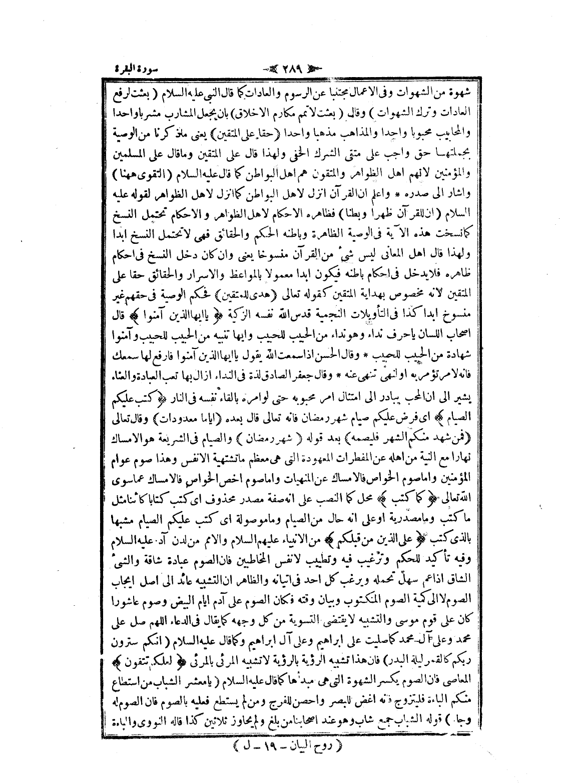 شهوة من الشهوات وفي الأعمال مجتنبا عن الرسوم والعادات كما قال النبي عليه السلام (بعثت لرفع العادات وترك الشهوات) وقال (بعثت لاتمم مكارم الأخلاق) بان يجعل المشارب مشربا واحدا والمحابيب محبوبا واحدا والمذاهب مذهبا واحدا حَقًّا عَلَى الْمُتَّقِينَ يعنى ما ذكرنا من الوصية بجملتها حق واجب على متقى الشرك الخفي ولهذا قال على المتقين وما قال على المسلمين والمؤمنين لانهم اهل الظواهر والمتقون هم اهل البواطن كما قال عليه السلام (التقوى هاهنا) وأشار الى صدره واعلم ان القرآن انزل لاهل البواطن كما انزل لاهل الظواهر لقوله عليه السلام (ان للقرآن ظهرا وبطنا) فظاهره الاحكام لاهل الظواهر والاحكام تحتمل النسخ كما نسخت هذه الآية في الوصية الظاهرة وباطنه الحكم والحقائق فهى لا تحتمل النسخ ابدا ولهذا قال اهل المعاني ليس شىء من القرآن منسوخا يعنى وان كان دخل النسخ في احكام ظاهره فلا يدخل في احكام باطنه فيكون ابدا معمولا بالمواعظ والاسرار والحقائق حقا على المتقين لانه مخصوص بهداية المتقين كقوله تعالى هُدىً لِلْمُتَّقِينَ فحكم الوصية في حقهم غير منسوخ ابدا كذا في التأويلات النجمية قدس الله نفسه الزكية يا أَيُّهَا الَّذِينَ آمَنُوا قال اصحاب اللسان يا حرف نداء وهو نداء من الحبيب للحبيب وايها تنبيه من الحبيب للحبيب وآمنوا شهادة من الحبيب للحبيب وقال الحسن إذا سمعت الله يقول يا ايها الذين آمنوا فارفع لها سمعك فانه لامر تؤمر به او لنهى تنهى عنه وقال جعفر الصادق لذة في النداء أزال بها تعب العبادة والعناء يشير الى ان المحب يبادر الى امتثال امر محبوبه حتى لوامره بإلقاء نفسه في النار كُتِبَ عَلَيْكُمُ الصِّيامُ اى فرض عليكم صيام شهر رمضان فانه تعالى قال بعده أَيَّاماً مَعْدُوداتٍ وقال تعالى فَمَنْ شَهِدَ مِنْكُمُ الشَّهْرَ فَلْيَصُمْهُ بعد قوله شَهْرُ رَمَضانَ والصيام في الشريعة هو الإمساك نهارا مع النية من اهله عن المفطرات المعهودة التي هي معظم ما تشتهية الأنفس وهذا صوم عوام المؤمنين واما صوم الخواص فالامساك عن المنهيات واما صوم أخص الخواص فالامساك عما سوى الله تعالى كَما كُتِبَ محل كما النصب على انه صفة مصدر محذوف اى كتب كتابا كائنا مثل ما كتب وما مصدرية او على انه حال من الصيام وما موصولة اى كتب عليكم الصيام مشبها بالذي كتب عَلَى الَّذِينَ مِنْ قَبْلِكُمْ من الأنبياء عليهم السلام والأمم من لدن آد عليه السلام وفيه تأكيد للحكم وترغيب فيه وتطبيب لانفس المخاطبين فان الصوم عبادة شاقة والشيء الشاق إذا عم سهل تحمله ويرغب كل أحد في إتيانه والظاهر ان التشبيه عائد الى اصل إيجاب الصوم لا الى كمية الصوم المكتوب وبيان وقته فكان الصوم على آدم ايام البيض وصوم عاشورا كان على قوم موسى والتشبيه لا يقتضى التسوية من كل وجهه كما يقال في الدعاء اللهم صل على محمد وعلى آل محمد كما صليت على ابراهيم وعلى آل ابراهيم وكما قال عليه السلام (انكم سترون ربكم كالقمر ليلة البدر) فان هذا تشبيه الرؤية بالرؤية لا تشبيه المرئي بالمرئي لَعَلَّكُمْ تَتَّقُونَ المعاصي فان الصوم يكسر الشهوة التي هي مبدأها كما قال عليه السلام (يا معشر الشباب من استطاع منكم الباءة فليتزوج فانه اغض للبصر وأحصن للفرج ومن لم يستطع فعليه بالصوم فان الصوم له وجاء) قوله الشباب جمع شاب وهو عند أصحابنا من بلغ ولم يحاوز ثلاثين كذا قاله النووي والباءة