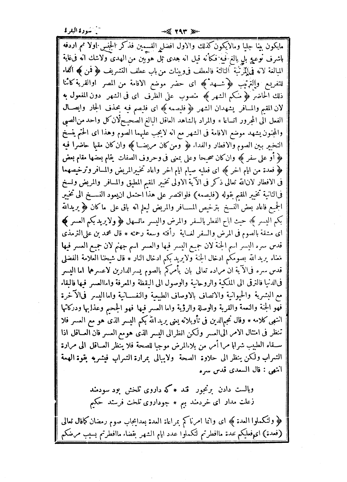 فَعِدَّةٌ مِنْ أَيَّامٍ أُخَرَ اى فعليه صيام ايام اخر وأعاد تخيير المريض والمسافر وترخيصهما فى الإفطار لان الله تعالى ذكر في الآية الاولى تخيير المقيم المطيق والمسافر والمريض ونسخ فى الثانية تخيير المقيم بقوله فَلْيَصُمْهُ فلو اقتصر على هذا احتمل ان يعود النسخ الى تخيير الجميع فاعاد بعض النسخ بترخيص المسافر والمريض ليعلم انه باق على ما كان يُرِيدُ اللَّهُ بِكُمُ الْيُسْرَ حيث أباح الفطر بالسفر والمرض واليسر ما تسهل وَلا يُرِيدُ بِكُمُ الْعُسْرَ اى مشقة بالصوم في المرض والسفر لغاية رأفته وسعة رحمته قال محمد بن على الترمذي قدس سره اليسر اسم الجنة لان جميع اليسر فيها والعسر اسم جهنم لان جميع العسر فيها معناه يريد الله بصومكم إدخال الجنة ولا يريد بكم إدخال النار قال شيخنا العلامة الفضلى قدس سره في الآية ان مراده تعالى بان يأمركم بالصوم يسر الدارين لا عسرهما اما اليسر فى الدنيا فالترقى الى الملكية والروحانية والوصول الى اليقظة والمعرفة واما العسر فيها فالبقاء مع البشرية والحيوانية والاتصاف بالأوصاف الطبيعية والنفسانية واما اليسر في الآخرة فهو الجنة والنعمة والقربة والوصلة والرؤية واما العسر فيها فهو الجحيم وعذابها ودركاتها انتهى كلامه وقال نجم الدين في تأويلاته يعنى يريد الله بكم اليسر الذي هو مع العسر فلا تنظر في امتثال الأمر الى العسر ولكن انظر الى اليسر الذي هو مع العسر فان العاقل إذا سقاه الطبيب شرابا مرا أمر من بلاء المرض موجبا للصحة فلا ينظر العاقل الى مرارة الشراب ولكن ينظر الى حلاوة الصحة ولا يبالى بمرارة الشراب فيشربه بقوة الهمة انتهى: قال السعدي قدس سره