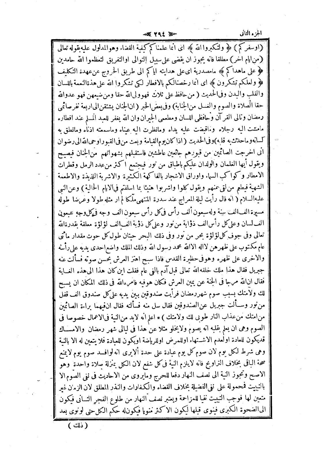 او سفركم وَلِتُكَبِّرُوا اللَّهَ اى انما علمناكم كيفية القضاء وهو المدلول عليه بقوله تعالى مِنْ أَيَّامٍ أُخَرَ مطلقا فانه يجوز ان يقضى على سبيل التوالي او التفريق لتعظموا الله حامدين عَلى ما هَداكُمْ ما مصدرية اى على هدايته إياكم الى طريق الخروج عن عهده التكليف وَلَعَلَّكُمْ تَشْكُرُونَ اى انما رخصنا لكم بالإفطار لكى تشكروا الله على هذه النعمة باللسان والقلب والبدن وفي الحديث (من حافظ على ثلاث فهو ولى الله حقا ومن ضيعهن فهو عدو الله حقا الصلاة والصوم والغسل من الجنابة) وفي بعض الخبر (ان الجنان يشتقن الى اربعة نفر صائمى رمضان وتالى القرآن وحافظى اللسان ومطعمى الجيران وان الله يغفر للعبد المسلم عند إفطاره ما مشت اليه رجلاه وما قبضت عليه يداه وما نظرت اليه عيناه وما سمعته أذناه وما نطق به لسانه وما حدث به قلبه) وفي الحديث (إذا كان يوم القيامة وبعث من في القبور اوحى الله الى رضوان انى أخرجت الصائمين من قبورهم جائعين عاطشين فاستقبلهم بشهواتهم من الجنان فيصيح ويقول أيها الغلمان والولدان عليكم باطباق من نور فيجتمع اكثر من عدد الرمل وقطرات الأمطار وكواكب السماء وأوراق الأشجار بالفاكهة الكثيرة والاشربة اللذيذة والاطعمة الشهية فيطعم من لقى منهم ويقول كلوا واشربوا هنيئا بما أسلفتم في الأيام الخالية) وعن النبي عليه السلام (انه قال رأيت ليلة المعراج عند سدرة المنتهى ملكا لم ار مثله طولا وعرضا طوله مسيرة الف الف سنة وله سبعون ألف رأس في كل رأس سبعون الف وجه في كل وجه سبعون الف لسان وعلى كل رأس الف ذؤابة من نور وعلى كل ذؤبة الف الف لؤلؤة معلقة بقدرة الله تعالى وفي جوف كل لؤلؤة بحر من نور وفي ذلك البحر حيتان طول كل حوت مقدار مائتى عام مكتوب على ظهرهن لا اله الا الله محمد رسول الله وذلك الملك واضع احدى يديه على رأسه والاخرى على ظهره وهو في حظيرة القدس فاذا سبح اهتز العرش بحسن صوته فسألت عنه جبريل فقال هذا ملك خلقه الله تعالى قبل آدم بألفي عام فقلت اين كان هذا الى هذه الغاية فقال ان الله مرجا في الجنة عن يمين العرش فكان هو فيه فامره الله في ذلك المكان ان يسبح لك ولا متك بسبب صوم شهر رمضان فرأيت صندوقين بين يديه على كل صندوق الف قفل من نور وسألت جبريل عن الصندوقين فقال سل منه فسألته فقال ان فيهما براءة الصائمين من أمتك من عذاب النار طوبى لك ولامتك) اعلم انه لا بد من النية في الأعمال خصوصا في الصوم وهي ان يعلم بقلبه انه يصوم ولا يخلو مثلا عن هذا في ليالى شهر رمضان والإمساك قد يكون للعادة او لعدم الاشتهاء او للمرض او للرياضة او يكون للعبادة فلا يتعين له الا بالنية وهي شرط لكل يوم لان صوم كل يوم عبادة على حدة ألا يرى انه لو أفسد صوم يوم لا يمنع صحة الباقي بخلاف التراويح فانه لا يلزم النية في كل شفع لان الكل بمنزلة صلاة واحدة وهو الأصح وتجوز النية الى نصف النهار دفعا للحرج وما يروى من الأحاديث في نفى الصوم الا بالتثبيت فمحمولة على نفى الفضيلة بخلاف القضاء والكفارات والنذر المطلق لان الزمان غير متعين لها فوجب التثبيت نفيا للمزاحمة ويعتبر نصف النهار من طلوع الفجر الثاني فيكون الى الضحوة الكبرى فينوى قبلها ليكون الأكثر منويا فيكون له حكم الكل حتى لو نوى بعد