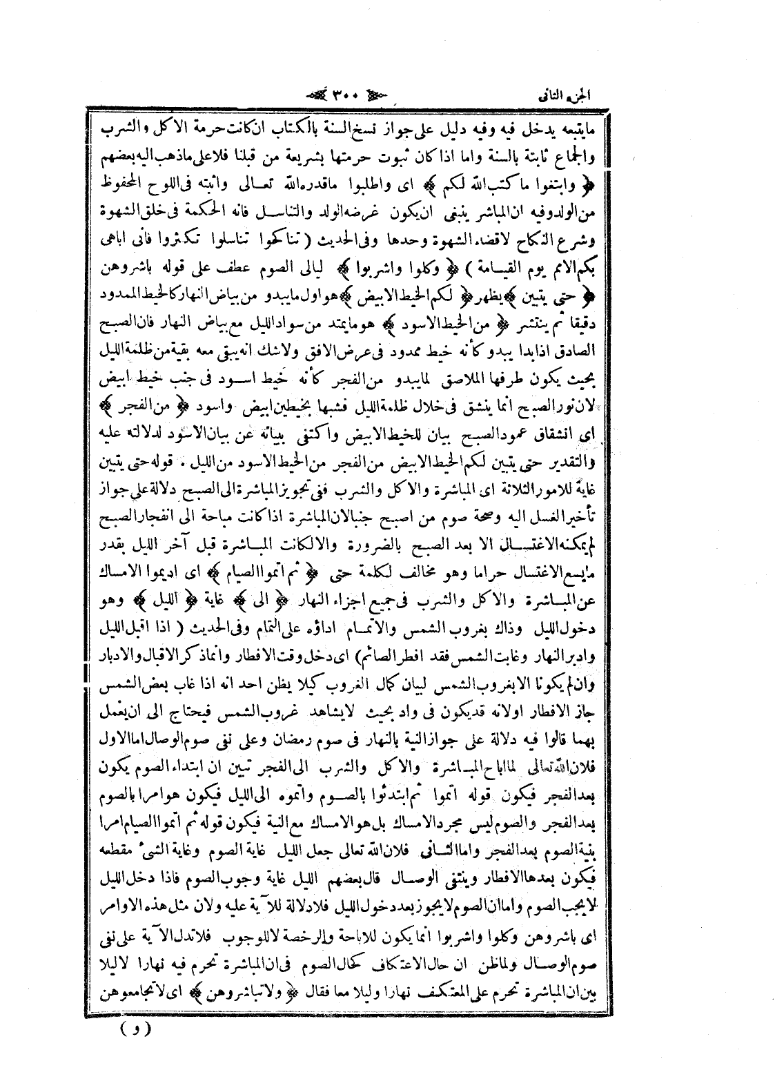 ظلمة الليل بحيث يكون طرفها الملاصق لما يبدو من الفجر كأنه خيط اسود في جنب خيط ابيض لان نور الصبح انما ينشق في خلال ظلمة الليل فشبها بخيطين ابيض واسود مِنَ الْفَجْرِ اى انشقاق عمود الصبح بيان للخيط الأبيض واكتفى ببيانه عن بيان الأسود لدلالته عليه والتقدير حتى يتبين لكم الخيط الأبيض من الفجر من الخيط الأسود من الليل. قوله حتى يتبين غاية للامور الثلاثة اى المباشرة والاكل والشرب ففى تجويز المباشرة الى الصبح دلالة على جواز تأخير الغسل اليه وصحة صوم من أصبح جنبا لان المباشرة إذا كانت مباحة الى انفجار الصبح لم يمكنه الاغتسال الا بعد الصبح بالضرورة والا لكانت المباشرة قبل آخر الليل بقدر ما يسع الاغتسال حراما وهو مخالف لكلمة حتى ثُمَّ أَتِمُّوا الصِّيامَ اى اديموا الإمساك عن المباشرة والاكل والشرب في جميع اجزاء النهار إِلى غاية اللَّيْلِ وهو دخول الليل وذاك بغروب الشمس والإتمام أداؤه على التمام وفي الحديث (إذا اقبل الليل وأدبر النهار وغابت الشمس فقد أفطر الصائم) اى دخل وقت الإفطار وانما ذكر الإقبال والأدبار وان لم يكونا الا بغروب الشمس لبيان كمال الغروب كيلا يظن أحد انه إذا غاب بعض الشمس جاز الإفطار او لانه قد يكون في واد بحيث لا يشاهد غروب الشمس فيحتاج الى ان يعمل بهما قالوا فيه دلالة على جواز النية بالنهار في صوم رمضان وعلى نفى صوم الوصال اما الاول فلان الله تعالى لما أباح المباشرة والاكل والشرب الى الفجر تبين ان ابتداء الصوم يكون بعد الفجر فيكون قوله أتموا ثم ابتدئوا بالصوم واتموه الى الليل فيكون هو امرا بالصوم بعد الفجر والصوم ليس مجرد الإمساك بل هو الإمساك مع النية فيكون قوله ثم أتموا الصيام امرا بنية الصوم بعد الفجر واما الثاني فلان الله تعالى جعل الليل غاية الصوم وغاية الشيء مقطعه فيكون بعدها الإفطار وينتفى الوصال قال بعضهم الليل غاية وجوب الصوم فاذا دخل الليل لا يجب الصوم واما ان الصوم لا يجوز بعد دخول الليل فلا دلالة للآية عليه ولان مثل هذه الأوامر اى باشروهن وكلوا واشربوا انما يكون للاباحة والرخصة لا للوجوب فلا تدل الآية على نفى صوم الوصال ولما ظن ان حال الاعتكاف كحال الصوم في ان المباشرة تحرم فيه نهارا لا ليلا بين ان المباشرة تحرم على المعتكف نهارا وليلا معا فقال وَلا تُبَاشِرُوهُنَّ اى لا تجامعوهن