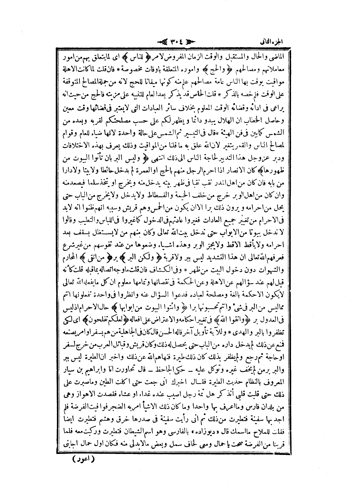 الى ذلك انتهى وَلَيْسَ الْبِرُّ بِأَنْ تَأْتُوا الْبُيُوتَ مِنْ ظُهُورِها كان الأنصار إذا احرم الرجل منهم بالحج او العمرة لم يدخل حائطا ولا بيتا ولا دارا من بابه فان كان من اهل المدر نقب نقبا في ظهر بيته يدخل منه ويخرج او يتخذ سلما فيصعد منه وان كان من اهل الوبر خرج من خلف الخيمة والفسطاط ولا يدخل ولا يخرج من الباب حتى يحل من إحرامه ويرون ذلك برا الا ان يكون من الحمس وهم قريش وسببه انهم ظنوا انه لا بد فى الإحرام من تغيير جميع العادات فغيروا عادتهم في الدخول كما غيروا في اللباس والتطيب وقالوا لا ندخل بيوتا من الأبواب حتى ندخل بيت الله تعالى وكان منهم من لا يستظل بسقف بعد إحرامه ولا يأقط الأقط ولا يجز الوبر وهذه أشياء وضعوها من عند نفوسهم من غير شرع فعرفهم الله تعالى ان هذا التشديد ليس ببر ولا قربة وَلكِنَّ الْبِرَّ بر مَنِ اتَّقى المحارم والشهوات دون دخول البيت من ظهر وفي الكشاف فان قلت ما وجه اتصاله بما قبله قلت كأنه قيل لهم عند سؤالهم عن الاهلة وعن الحكمة في نقصانها وتمامها معلوم ان كل ما يفعله الله تعالى لا يكون الا حكمة بالغة ومصلحة لعباده فدعوا السؤال عنه وانظروا في واحدة تفعلونها أنتم مما ليس من البر في شىء وأنتم تحسبونها برا وَأْتُوا الْبُيُوتَ مِنْ أَبْوابِها حال الإحرام إذ ليس فى العدول بر وَاتَّقُوا اللَّهَ فى تغيير أحكامه والاعتراض على أفعاله لَعَلَّكُمْ تُفْلِحُونَ اى لكى تظفروا بالبر والهدى وللآية تأويل آخر قاله الحسن قال كان في الجاهلية من هم بسفر او امر يصنعه فمنع عن ذلك لم يدخل داره من الباب حتى يحصل له ذلك وكان قريش وقبائل العرب من خرج لسفر او حاجة ثم رجع ولم يظفر بذلك كان ذلك طيرة فنهاهم الله عن ذلك واخبر ان الطيرة ليس ببر والبر بر من لم يخف غيره وتوكل عليه- حكى الجاحظ- قال تحاورت انا وابراهيم بن سيار المعروف بالنظام حديث الطيرة فقال أخبرك انى جعت حتى أكلت الطين وما صبرت على ذلك حتى قلبت قلبى أتذكر هل ثمة رجل أصيب عنده غداء او عشاء فقصدت الأهواز وهي من بلدان فارس وما اعرف بها واحدا وما كان ذلك إلا شيئا امر به الضجر فوافيت الفرضة فلم أجد بها سفينة فتطيرت من ذلك ثم انى رأيت سفينة في صدرها خرق وهشم فتطيرت ايضا فقلت للملاح ما اسمك قال «ديو زاده» بالفارسي وهو اسم الشيطان فتطيرت وركبت معه فلما قربنا من الفرضة صحت يا حمال ومعى لحاف سمل وبعض ما لا بدلى منه فكان أول حمال أجابني