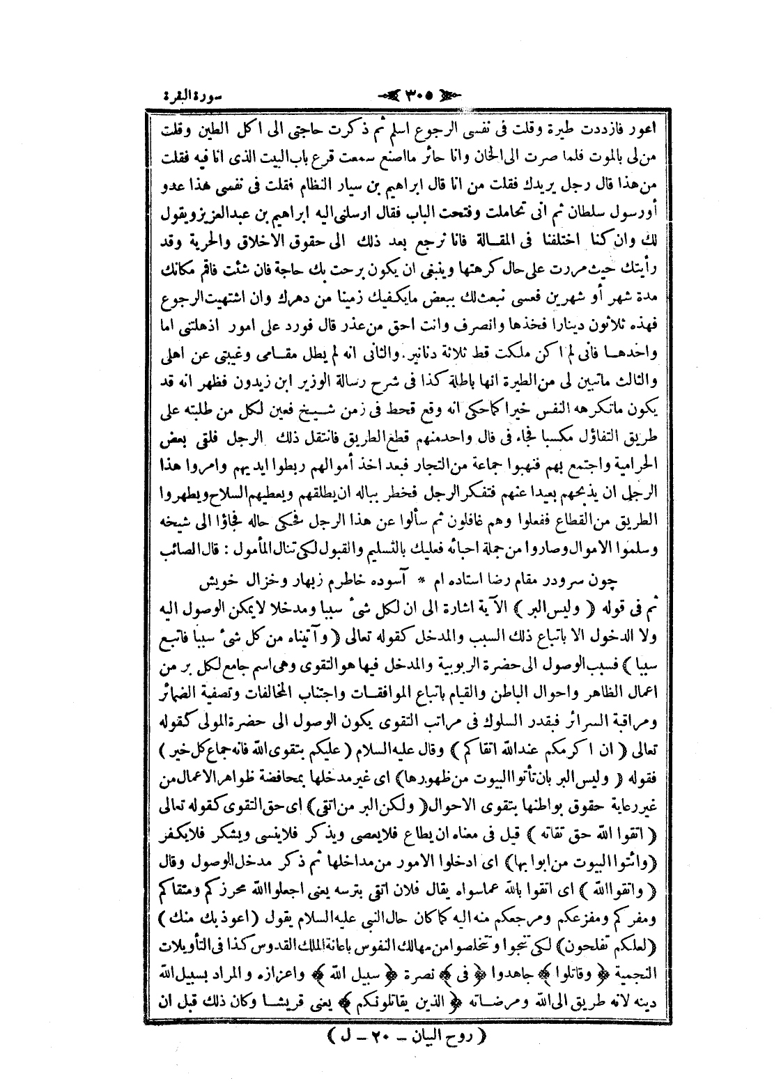 ثم في قوله وَلَيْسَ الْبِرُّ الآية اشارة الى ان لكل شىء سببا ومدخلا لا يمكن الوصول اليه ولا الدخول الا باتباع ذلك السبب والمدخل كقوله تعالى وَآتَيْناهُ مِنْ كُلِّ شَيْءٍ سَبَباً فَأَتْبَعَ سَبَباً فسبب الوصول الى حضرة الربوبية والمدخل فيها هو التقوى وهي اسم جامع لكل بر من اعمال الظاهر واحوال الباطن والقيام باتباع الموافقات واجتناب المخالفات وتصفية الضمائر ومراقبة السرائر فبقدر السلوك في مراتب التقوى يكون الوصول الى حضرة المولى كقوله تعالى إِنَّ أَكْرَمَكُمْ عِنْدَ اللَّهِ أَتْقاكُمْ وقال عليه السلام (عليكم بتقوى الله فانه جماع كل خير) فقوله وَلَيْسَ الْبِرُّ بِأَنْ تَأْتُوا الْبُيُوتَ مِنْ ظُهُورِها اى غير مدخلها بمحافضة ظواهر الأعمال من غير رعاية حقوق بواطنها بتقوى الأحوال وَلكِنَّ الْبِرَّ مَنِ اتَّقى اى حق التقوى كقوله تعالى اتَّقُوا اللَّهَ حَقَّ تُقاتِهِ قيل في معناه ان يطاع فلا يعصى ويذكر فلا ينسى ويشكر فلا يكفر وَأْتُوا الْبُيُوتَ مِنْ أَبْوابِها اى ادخلوا الأمور من مداخلها ثم ذكر مدخل الوصول وقال وَاتَّقُوا اللَّهَ اى اتقوا بالله عما سواه يقال فلان اتقى بترسه يعنى اجعلوا الله محرزكم ومتقاكم ومفركم ومفزعكم ومرجعكم منه اليه كما كان حال النبي عليه السلام يقول (أعوذ بك منك) لَعَلَّكُمْ تُفْلِحُونَ لكى تنجوا وتتخلصوا من مهالك النفوس باعانة الملك القدوس كذا في التأويلات النجمية وَقاتِلُوا جاهدوا فِي نصرة سَبِيلِ اللَّهِ وإعزازه والمراد بسبيل الله دينه لانه طريق الى الله ومرضاته الَّذِينَ يُقاتِلُونَكُمْ يعنى قريشا وكان ذلك قبل ان