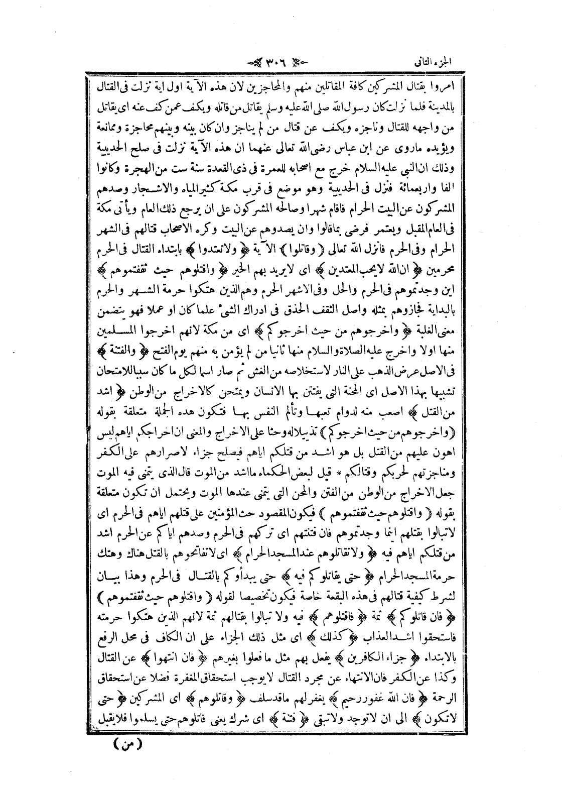 أمروا بقتال المشركين كافة المقاتلين منهم والمحاجزين لان هذه الآية أول اية نزلت في القتال بالمدينة فلما نزلت كان رسول الله صلى الله عليه وسلم يقاتل من قاتله ويكف عمن كف عنه اى يقاتل من واجهه للقتال وناجزه ويكف عن قتال من لم يناجز وان كان بينه وبينهم محاجزة وممانعة ويؤيده ما روى عن ابن عباس رضي الله تعالى عنهما ان هذه الآية نزلت في صلح الحديبية وذلك ان النبي عليه السلام خرج مع أصحابه للعمرة في ذى القعدة سنة ست من الهجرة وكانوا الفا واربعمائة فنزل في الحديبية وهو موضع في قرب مكة كثير المياه والأشجار وصدهم المشركون عن البيت الحرام فاقام شهرا وصالحه المشركون على ان يرجع ذلك العام ويأتى مكة فى العام المقبل ويعتمر فرصى بما قالوا وان يصدوهم عن البيت وكره الاصحاب قتالهم في الشهر الحرام وفي الحرم فانزل الله تعالى وَقاتِلُوا الآية وَلا تَعْتَدُوا بابتداء القتال في الحرم محرمين إِنَّ اللَّهَ لا يُحِبُّ الْمُعْتَدِينَ اى لا يريد بهم الخير وَاقْتُلُوهُمْ حَيْثُ ثَقِفْتُمُوهُمْ اين وجدتموهم في الحرم والحل وفي الأشهر الحرم وهم الذين هتكوا حرمة الشهر والحرم بالبداية فجازوهم بمثله واصل الثقف الحذق في ادراك الشيء علما كان او عملا فهو يتضمن معنى الغلبة وَأَخْرِجُوهُمْ مِنْ حَيْثُ أَخْرَجُوكُمْ اى من مكة لانهم اخرجوا المسلمين منها اولا واخرج عليه الصلاة والسلام منها ثانيا من لم يؤمن به منهم يوم الفتح وَالْفِتْنَةُ فى الأصل عرض الذهب على النار لاستخلاصه من الغش ثم صار اسما لكل ما كان سببا للامتحان تشبيها بهذا الأصل اى المحنة التي يفتتن بها الإنسان ويمتحن كالاخراج من الوطن أَشَدُّ مِنَ الْقَتْلِ أصعب منه لدوام تعبها وتألم النفس بها فتكون هذه الجملة متعلقة بقوله وَأَخْرِجُوهُمْ مِنْ حَيْثُ أَخْرَجُوكُمْ تذييلا له وحثا على الإخراج والمعنى ان إخراجكم إياهم ليس أهون عليهم من القتل بل هو أشد من قتلكم إياهم فيصلح جزاء لاصرارهم على الكفر ومناجزتهم لحربكم وقتالكم قيل لبعض الحكماء ما أشد من الموت قال الذي يتمنى فيه الموت جعل الإخراج من الوطن من الفتن والمحن التي يتمنى عندها الموت ويحتمل ان تكون متعلقة بقوله وَاقْتُلُوهُمْ حَيْثُ ثَقِفْتُمُوهُمْ فيكون المقصود حث المؤمنين على قتلهم إياهم في الحرم اى لا تبالوا بقتلهم أينما وجدتموهم فان فتنتهم اى تركهم في الحرم وصدهم إياكم عن الحرم أشد من قتلكم إياهم فيه وَلا تُقاتِلُوهُمْ عِنْدَ الْمَسْجِدِ الْحَرامِ اى لا تفاتحوهم بالقتل هناك وهتك حرمة المسجد الحرام حَتَّى يُقاتِلُوكُمْ فِيهِ حتى يبدأوكم بالقتال في الحرم وهذا بيان لشرط كيفية قتالهم في هذه البقعة خاصة فيكون تخصيصا لقوله وَاقْتُلُوهُمْ حَيْثُ ثَقِفْتُمُوهُمْ فَإِنْ قاتَلُوكُمْ ثمة فَاقْتُلُوهُمْ فيه ولا تبالوا بقتالهم ثمة لانهم الذين هتكوا حرمته فاستحقوا أشد العذاب كَذلِكَ اى مثل ذلك الجزاء على ان الكاف في محل الرفع بالابتداء جَزاءُ الْكافِرِينَ يفعل بهم مثل ما فعلوا بغيرهم فَإِنِ انْتَهَوْا عن القتال وكذا عن الكفر فان الانتهاء عن مجرد القتال لا يوجب استحقاق المغفرة فضلا عن استحقاق الرحمة فَإِنَّ اللَّهَ غَفُورٌ رَحِيمٌ يغفر لهم ما قد سلف وَقاتِلُوهُمْ اى المشركين حَتَّى لا تَكُونَ الى ان لا توجد ولا تبقى فِتْنَةٌ اى شرك يعنى قاتلوهم حتى يسلموا فلا يقبل