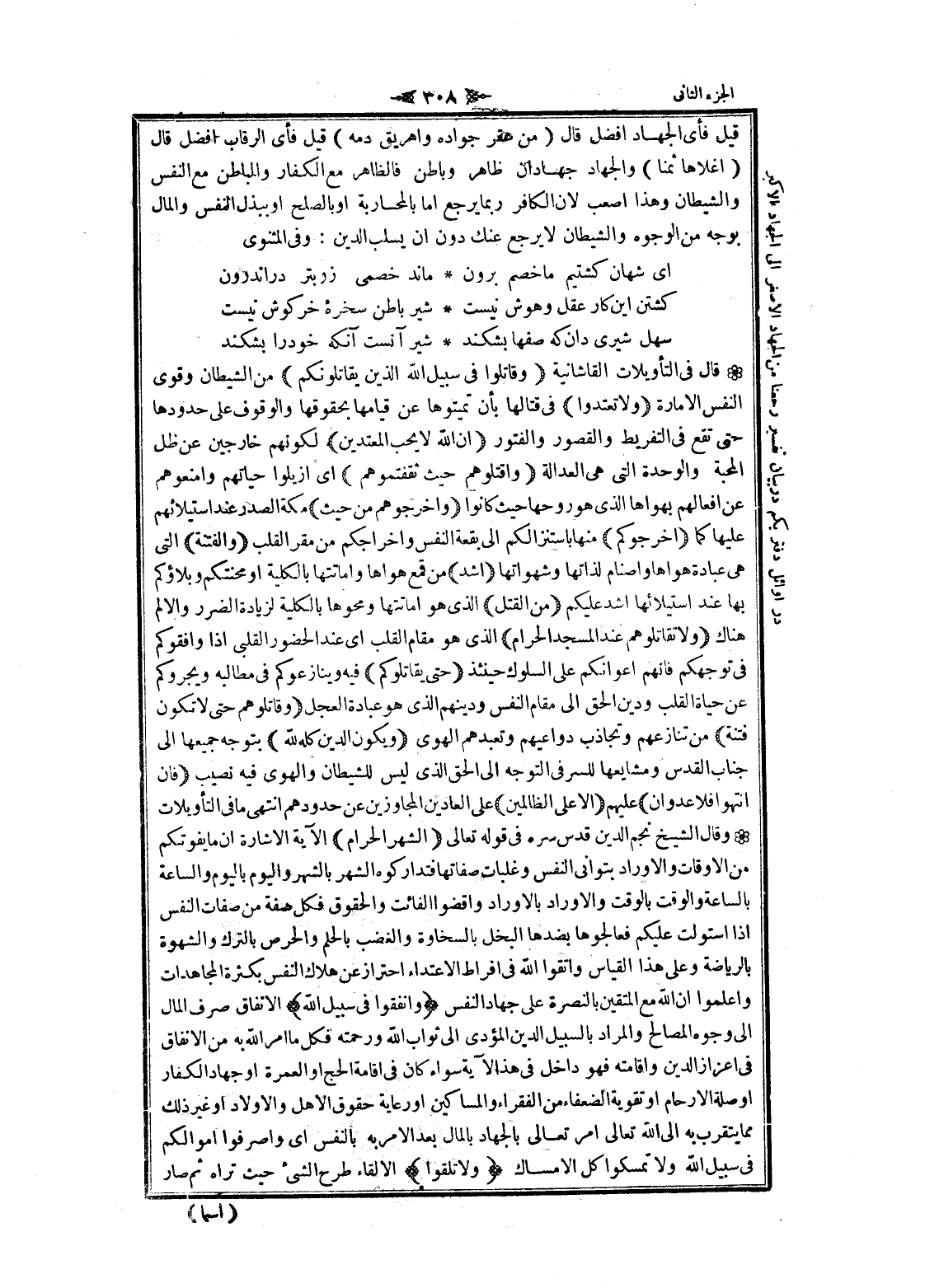 قال في التأويلات القاشانية وَقاتِلُوا فِي سَبِيلِ اللَّهِ الَّذِينَ يُقاتِلُونَكُمْ من الشيطان وقوى النفس الامارة وَلا تَعْتَدُوا فى قتالها بأن تميتوها عن قيامها بحقوقها والوقوف على حدودها حتى تقع في التفريط والقصور والفتور إِنَّ اللَّهَ لا يُحِبُّ الْمُعْتَدِينَ لكونهم خارجين عن ظل المحبة والوحدة التي هي العدالة وَاقْتُلُوهُمْ حَيْثُ ثَقِفْتُمُوهُمْ اى أزيلوا حياتهم وامنعوهم عن أفعالهم بهواها الذي هو روحها حيث كانوا وَأَخْرِجُوهُمْ مِنْ حَيْثُ مكة الصدر عند استيلائهم عليها كما أَخْرَجُوكُمْ منها باستنزالكم الى بقعة النفس وإخراجكم من مقر القلب وَالْفِتْنَةُ التي هى عبادة هواها وأصنام لذاتها وشهواتها أَشَدُّ من قمع هواها واماتتها بالكلية او محنتكم وبلاؤكم بها عند استيلائها أشد عليكم مِنَ الْقَتْلِ الذي هو اماتتها ومحوها بالكلية لزيادة الضرر والألم هناك وَلا تُقاتِلُوهُمْ عِنْدَ الْمَسْجِدِ الْحَرامِ الذي هو مقام القلب اى عند الحضور القلبي إذا وافقوكم فى توجهكم فانهم اعوانكم على السلوك حينئذ حَتَّى يُقاتِلُوكُمْ فيه وينازعوكم في مطالبه ويجروكم عن حياة القلب ودين الحق الى مقام النفس ودينهم الذي هو عبادة العجل وَقاتِلُوهُمْ حَتَّى لا تَكُونَ فِتْنَةٌ من تنازعهم وتجاذب دواعيهم وتعبدهم الهوى وَيَكُونَ الدِّينُ كُلُّهُ لِلَّهِ بتوجه جميعها الى جناب القدس ومشايعها للسر في التوجه الى الحق الذي ليس للشيطان والهوى فيه نصيب فَإِنِ انْتَهَوْا فَلا عُدْوانَ عليهم إِلَّا عَلَى الظَّالِمِينَ على العادين المجاوزين عن حدودهم انتهى ما في التأويلات وقال الشيخ نجم الدين قدس سره في قوله تعالى الشَّهْرُ الْحَرامُ الآية الاشارة ان ما يفوتكم من الأوقات والأوراد بتواني النفس وغلبات صفاتها فتداركوه الشهر بالشهر واليوم باليوم والساعة بالساعة والوقت بالوقت والأوراد بالاوراد واقضوا الفائت والحقوق فكل صفة من صفات النفس إذا استولت عليكم فعالجوها بضدها البخل بالسخاوة والغضب بالحلم والحرص بالترك والشهوة بالرياضة وعلى هذا القياس واتقوا الله في افراط الاعتداء احتراز عن هلاك النفس بكثرة المجاهدات واعلموا ان الله مع المتقين بالنصرة على جهاد النفس وَأَنْفِقُوا فِي سَبِيلِ اللَّهِ الانفاق صرف المال الى وجوه المصالح والمراد بالسبيل الدين المؤدى الى ثواب الله ورحمته فكل ما امر الله به من الانفاق فى إعزاز الدين وإقامته فهو داخل في هذا لآية سواء كان في اقامة الحج او العمرة او جهاد الكفار او صلة الأرحام او تقوية الضعفاء من الفقراء والمساكين او رعاية حقوق الأهل والأولاد او غير ذلك مما يتقرب به الى الله تعالى امر تعالى بالجهاد بالمال بعد الأمر به بالنفس اى واصرفوا أموالكم فى سبيل الله ولا تمسكوا كل الإمساك وَلا تُلْقُوا الإلقاء طرح الشيء حيث تراه ثم صار