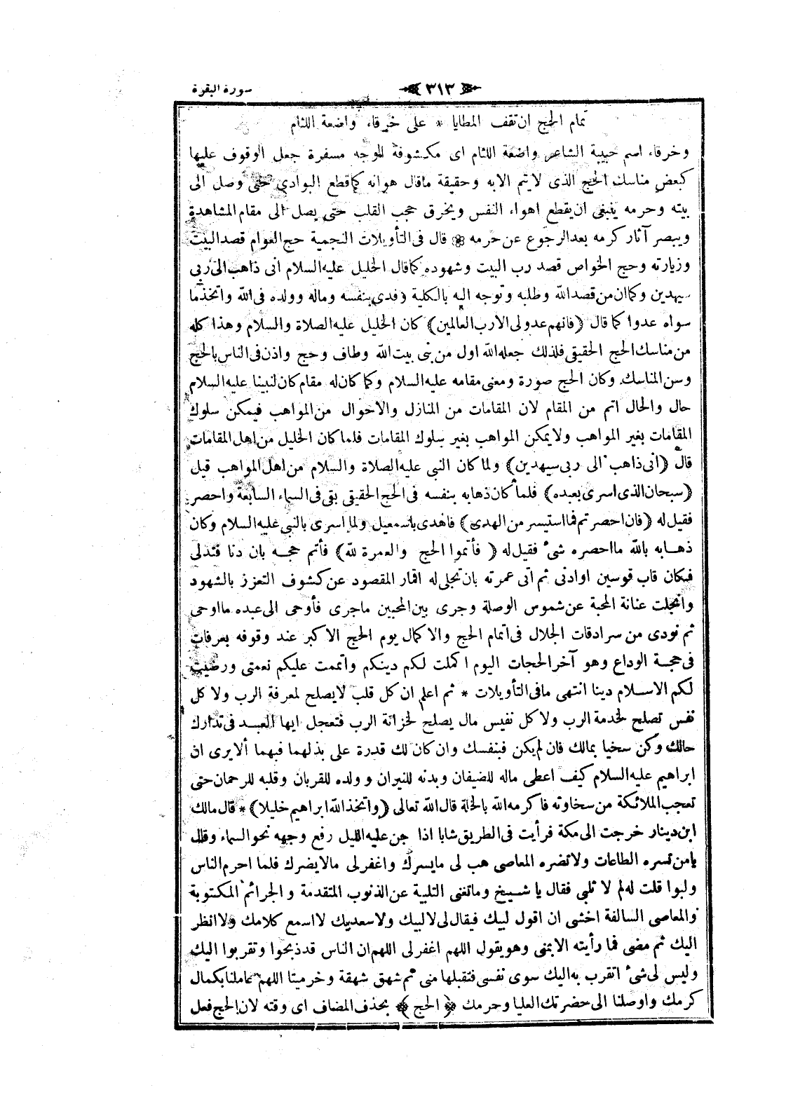 وخرقاء اسم حبيبة الشاعر واضعة اللثام اى مكشوفة الوجه مسفرة جعل الوقوف عليها كبعض مناسك الحج الذي لا يتم الا به وحقيقة ما قال هو انه كما قطع البوادي حتى وصل الى بيته وحرمه ينبغى ان يقطع أهواء النفس ويخرق حجب القلب حتى يصل الى مقام المشاهدة ويبصر آثار كرمه بعد الرجوع عن حرمه قال في التأويلات النجمية حج العوام قصد البيت وزيارته وحج الخواص قصد رب البيت وشهوده كما قال الخليل عليه السلام انى ذاهب الى ربى سيهدين وكما ان من قصد الله وطلبه وتوجه اليه بالكلية وفدى بنفسه وماله وولده في الله واتخذ ما سواه عدوا كما قال فَإِنَّهُمْ عَدُوٌّ لِي إِلَّا رَبَّ الْعالَمِينَ كان الخليل عليه الصلاة والسلام وهذا كله من مناسك الحج الحقيقي فلذلك جعله الله أول من بنى بيت الله وطاف وحج واذن في الناس بالحج وسن المناسك وكان الحج صورة ومعنى مقامه عليه السلام وكما كان له مقام كان لنبينا عليه السلام حال والحال أتم من المقام لان المقامات من المنازل والأحوال من المواهب فيمكن سلوك المقامات بغير المواهب ولا يمكن المواهب بغير سلوك المقامات فلما كان الخليل من اهل المقامات قال إِنِّي ذاهِبٌ إِلى رَبِّي سَيَهْدِينِ ولما كان النبي عليه الصلاة والسلام من اهل المواهب قيل سُبْحانَ الَّذِي أَسْرى بِعَبْدِهِ فلما كان ذهابه بنفسه في الحج الحقيقي بقي في السماء السابعة وأحصر فقيل له فَإِنْ أُحْصِرْتُمْ فَمَا اسْتَيْسَرَ مِنَ الْهَدْيِ فاهدى باسمعيل ولما اسرى بالنبي عليه السلام وكان ذهابه بالله ما احصره شىء فقيل له وَأَتِمُّوا الْحَجَّ وَالْعُمْرَةَ لِلَّهِ فأتم حجه بان دنا فتدلى فكان قاب قوسين او ادنى ثم اتى عمرته بان تجلى له أقمار المقصود عن كشوف التعزز بالشهود وانجلت عنانة المحبة عن شموس الوصلة وجرى بين المحبين ما جرى فأوحى الى عبده ما اوحى ثم نودى من سرادقات الجلال في إتمام الحج والا كمال يوم الحج الأكبر عند وقوفه بعرفات فى حجة الوداع وهو آخر الحجات اليوم أكملت لكم دينكم وأتممت عليكم نعمتى ورضيت لكم الإسلام دينا انتهى ما في التأويلات ثم اعلم ان كل قلب لا يصلح لمعرفة الرب ولا كل نفس تصلح لخدمة الرب ولا كل نفيس مال يصلح لخزانة الرب فتعجل ايها العبد في تدارك حالك وكن سخيا بمالك فان لم يكن فبنفسك وان كان لك قدرة على بذلهما فبهما ألا يرى ان ابراهيم عليه السلام كيف اعطى ما له للضيفان وبدنه للنيران وولده للقربان وقلبه للرحمان حتى تعجب الملائكة من سخاوته فاكرمه الله بالخلة قال الله تعالى وَاتَّخَذَ اللَّهُ إِبْراهِيمَ خَلِيلًا قال مالك ابن دينار خرجت الى مكة فرأيت في الطريق شابا إذا جن عليه الليل رفع وجهه نحو السماء وقال يا من تسره الطاعات ولا تضره المعاصي هب لى ما يسرك واغفر لى ما لا يضرك فلما احرم الناس ولبوا قلت له لم لا تلبى فقال يا شيخ وما تغنى التلبية عن الذنوب المتقدمة والجرائم المكتوبة والمعاصي السالفة أخشى ان أقول لبيك فيقال لى لا لبيك ولا سعديك لا اسمع كلامك ولا انظر إليك ثم مضى فما رأيته الا بمنى وهو يقول اللهم اغفر لى اللهم ان الناس قد ذبحوا وتقربوا إليك وليس لى شىء أتقرب به إليك سوى نفسى فتقبلها منى ثم شهق شهقة وخرمتا اللهم عاملنا بكمال كرمك وأوصلنا الى حضرتك العليا وحرمك الْحَجُّ بحذف المضاف اى وقته لان الحج فعل