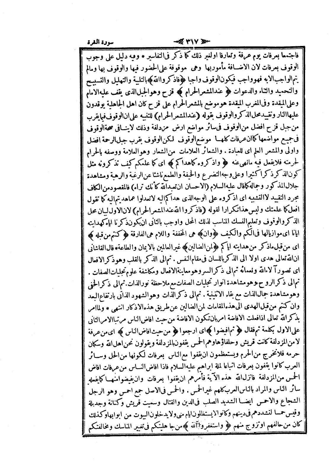 ثم الى ذكر الروح وهو مشاهدة أنوار تجليات الصفات مع ملاحظة نور الذات. ثم الى ذكر الخفي وهو مشاهدة جمال الذات مع بقاء الاثنينية. ثم الى ذكر الذات وهو الشهود الذاتي بارتفاع البعد وان كنتم من قبل الهدى الى هذه المقامات لمن الضالين عن طريق هذه الاذكار انتهى ولما امر بذكر الله تعالى إذا فعلت الافاضة امر بان تكون الافاضة من حيث أفاض الناس مرتبا الأمر الثاني على الاول بكلمة ثم فقال ثُمَّ أَفِيضُوا اى ارجعوا مِنْ حَيْثُ أَفاضَ النَّاسُ اى من عرفة لا من المزدلفة كانت قريش وحلفاؤها وهم الحمس يقفون بالمزدلفة ويقولون نحن اهل الله وسكان حرمه فلا نخرج من الحرم ويستعظمون ان يقفوا مع الناس بعرفات لكونها من الحل وسائر العرب كانوا يقفون بعرفات اتباعا لملة ابراهيم عليه السلام فاذا أفاض الناس من عرفات أفاض الحمس من المزدلفة فانزل الله هذه الآية فأمرهم ان يقفوا بعرفات وان يفيضوا منها كما يفعله سائر الناس والمراد بالناس العرب كلهم غير الحمس. والحمس في الأصل جمع احمس وهو الرجل الشجاع والأحمس ايضا الشديد الصلب في الدين والقتال وسميت قريش وكنانة وجديلة وقيس حمسا لتشددهم في دينهم وكانوا لا يستظلون ايام منى ولا يدخلون البيوت من ابوابها وكذلك كان من حالفهم او تزوج منهم وَاسْتَغْفِرُوا اللَّهَ من جاهليتكم في تغيير المناسك ومخالفتكم