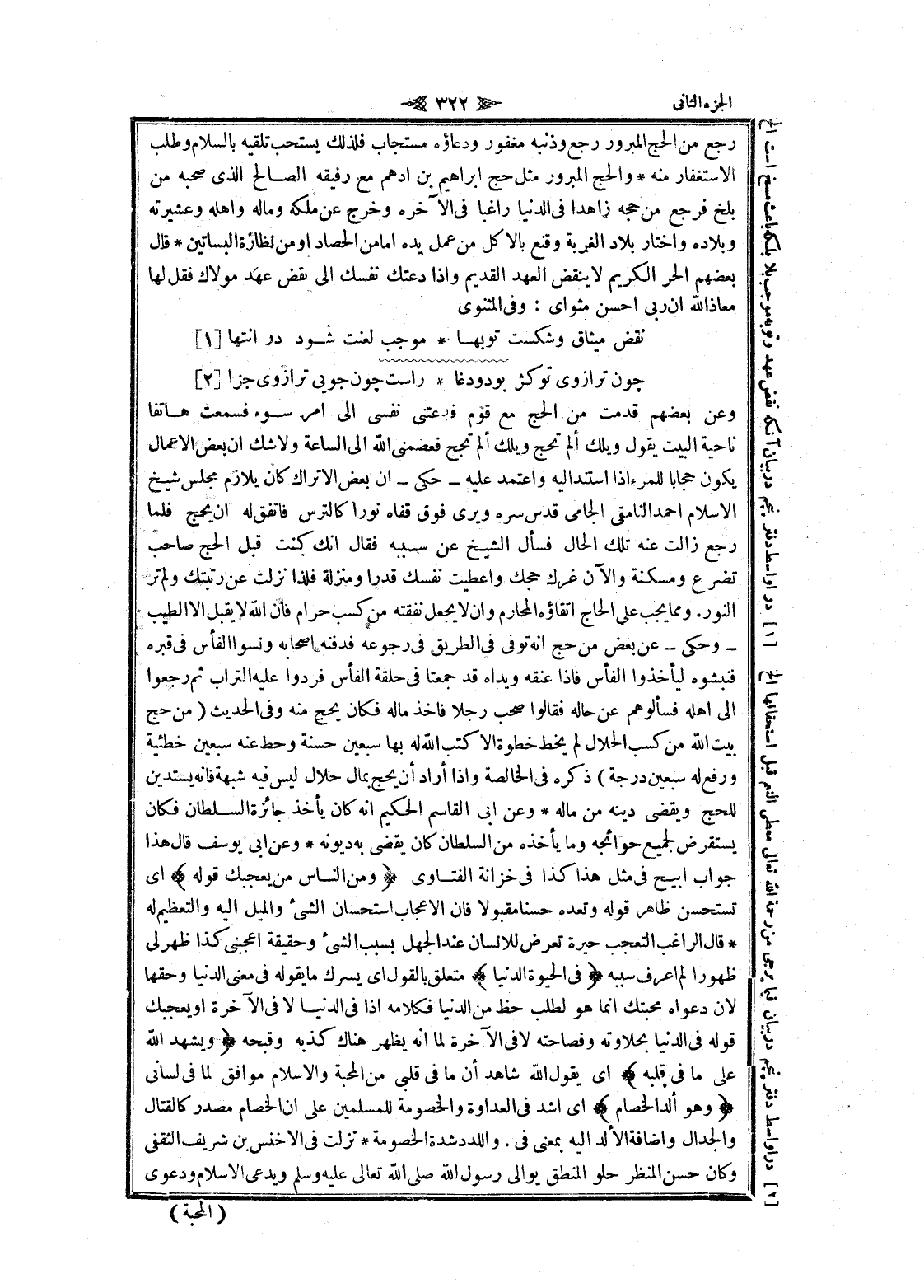 رجع من الحج المبرور رجع وذنبه مغفور ودعاؤه مستجاب فلذلك يستحب تلقيه بالسلام وطلب الاستغفار منه والحج المبرور مثل حج ابراهيم بن أدهم مع رفيقه الصالح الذي صحبه من بلخ فرجع من حجه زاهدا في الدنيا راغبا في الآخرة وخرج عن ملكه وماله واهله وعشيرته وبلاده واختار بلاد الغربة وقنع بالأكل من عمل يده اما من الحصاد او من نظارة البساتين قال بعضهم الحر الكريم لا ينقض العهد القديم وإذا دعتك نفسك الى نقض عهد مولاك فقل لها معاذ الله ان ربى احسن مثواى: وفي المثنوى