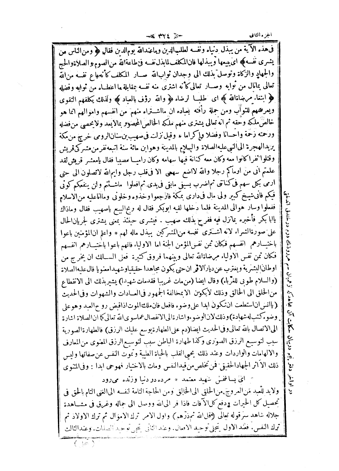 فيها سهامه وكان راميا مصيبا فقال يا معشر قريش لقد علمتم انى من ارماكم رجلا والله لا أضع سهمى الا في قلب رجل وايم الله لا تصلون الى حتى ارمى بكل سهم في كنانتى ثم اضرب بسيفى ما بقي في يدى ثم افعلوا ما شئتم ولن ينفعكم كونى فيكم فانى شيخ كبير ولى مال في دارى بمكة فارجعوا وخذوه وخلونى وما انا عليه من الإسلام ففعلوا وسار هو الى المدينة فلما دخلها لقيه ابو بكر فقال له ربح البيع يا صهيب فقال وما ذاك يا أبا بكر فأخبره بما نزل فيه ففرح بذلك صهيب. فيشرى حينئذ بمعنى يشترى لجريان الحال على صورة الشراء لانه اشترى نفسه من المشركين ببذل ماله لهم واعلم ان المؤمنين باعوا باختيارهم أنفسهم فكان ثمن نفس المؤمن الجنة اما الأولياء فانهم باعوا باختيارهم أنفسهم فكان ثمن نفس الأولياء مرضاة الله تعالى وبينهما فروق كثيرة فعلى السالك ان يخرج من أوطان البشرية ويغترب عن ديار الاقران حتى يكون مجاهدا حقيقيا وشهيدا معنويا قال عليه الصلاة (والسلام طوبى للغرباء) وقال ايضا (من مات غريبا فقد مات شهيدا) يشير بذلك الى الانقطاع من الخلق الى الخالق وذلك لا يكون الا بمخالفة الجمهور في العادات والشهوات وفي الحديث (يا انس ان استطعت ان تكون ابدا على وضوء فافعل فان ملك الموت إذا قبض روح العبد وهو على وضوء كتب له شهادة) وذلك لان الوضوء واشارة الى الانفصال عما سوى الله تعالى كما ان الصلاة اشارة الى الاتصال بالله تعالى وفي الحديث ايضا (دم على الطهارة يوسع عليك الرزق) فالطهارة الصورية سبب لتوسيع الرزق الصوري وكذا طهارة الباطن سبب لتوسيع الرزق المعنوي من المعارف والإلهامات والواردات وعند ذلك يحيى القلب بالحياة الطيبة وتموت النفس عن صفاتها وليس ذلك الا اثر الجهاد الحقيقي فمن تخلص من قيد النفس ومات بالاختيار فهو حى ابدا: وفي المثنوى