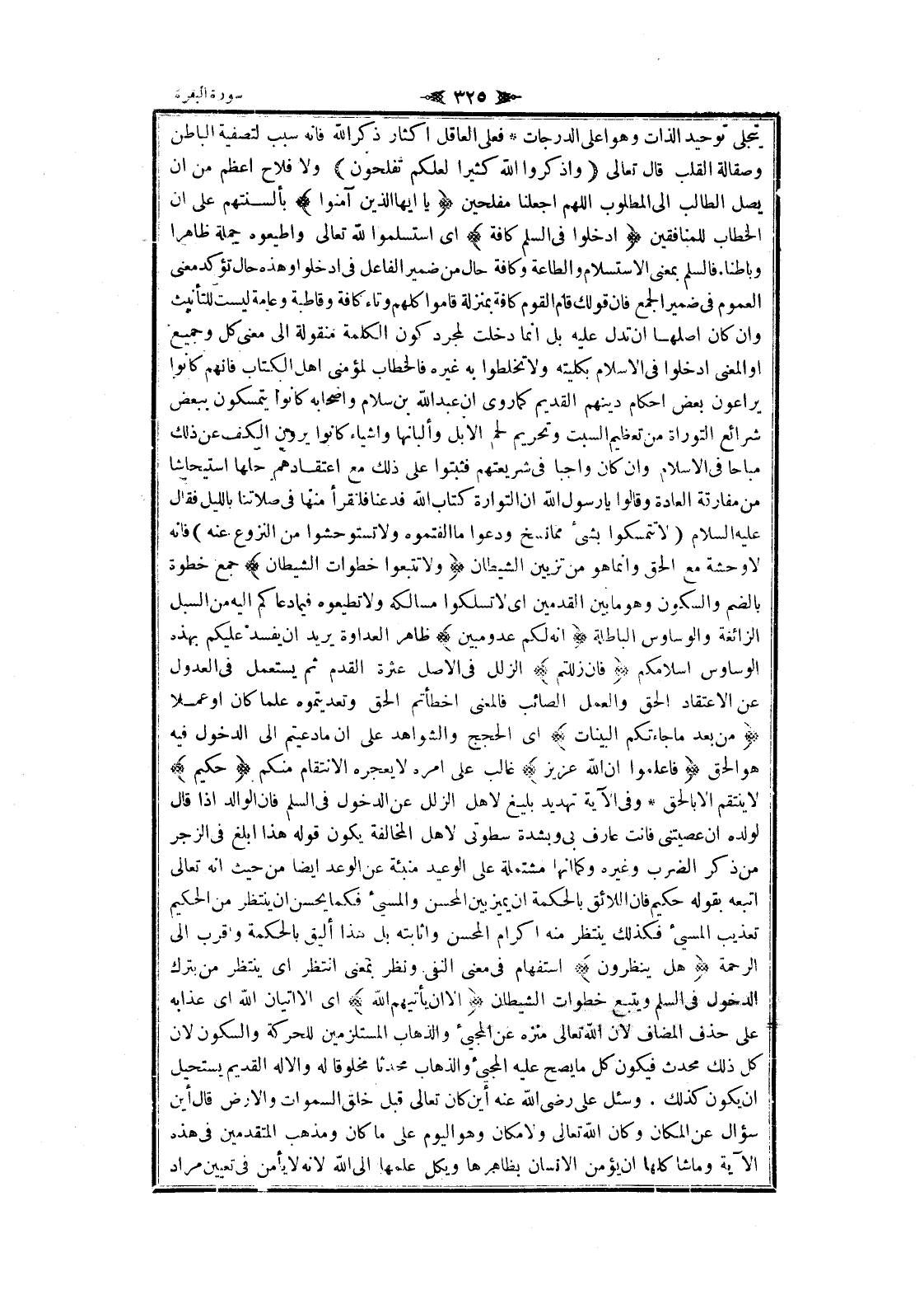 يتجلى توحيد الذات وهو أعلى الدرجات فعلى العاقل إكثار ذكر الله فانه سبب لتصفية الباطن وصقالة القلب قال تعالى وَاذْكُرُوا اللَّهَ كَثِيراً لَعَلَّكُمْ تُفْلِحُونَ ولا فلاح أعظم من ان يصل الطالب الى المطلوب اللهم اجعلنا مفلحين يا أَيُّهَا الَّذِينَ آمَنُوا بألسنتهم على ان الخطاب للمنافقين ادْخُلُوا فِي السِّلْمِ كَافَّةً اى استسلموا لله تعالى وأطيعوه جملة ظاهرا وباطنا. فالسلم بمعنى الاستسلام والطاعة وكافة حال من ضمير الفاعل في ادخلوا وهذه حال تؤكد معنى العموم في ضمير الجمع فان قولك قام القوم كافة بمنزلة قاموا كلهم وتاء كافة وقاطبة وعامة ليست للتأنيث وان كان أصلها ان تدل عليه بل انما دخلت لمجرد كون الكلمة منقولة الى معنى كل وجميع او المعنى ادخلوا في الإسلام بكليته ولا تخلطوا به غيره فالخطاب لمؤمنى اهل الكتاب فانهم كانوا يراعون بعض احكام دينهم القديم كما روى ان عبد الله بن سلام وأصحابه كانوا يتمسكون ببعض شرائع التوراة من تعظيم السبت وتحريم لحم الإبل وألبانها وأشياء كانوا يرون الكف عن ذلك مباحا في الإسلام وان كان واجبا في شريعتهم فثبتوا على ذلك مع اعتقادهم حلها استيحاشا من مفارقة العادة وقالوا يا رسول الله ان التوراة كتاب الله فدعنا فلنقرأ منها في صلاتنا بالليل فقال عليه السلام (لا تتمسكوا بشئ مما نسخ ودعوا ما ألفتموه ولا تستوحشوا من النزوع عنه) فانه لا وحشة مع الحق وانما هو من تزيين الشيطان وَلا تَتَّبِعُوا خُطُواتِ الشَّيْطانِ جمع خطوة بالضم والسكون وهو ما بين القدمين اى لا تسلكوا مسالكه ولا تطيعوه فيما دعاكم اليه من السبل الزائغة والوساوس الباطلة إِنَّهُ لَكُمْ عَدُوٌّ مُبِينٌ ظاهر العداوة يريد ان يفسد عليكم بهذه الوساوس إسلامكم فَإِنْ زَلَلْتُمْ الزلل في الأصل عثرة القدم ثم يستعمل في العدول عن الاعتقاد الحق والعمل الصائب فالمعنى اخطأتم الحق وتعديتموه علما كان او عملا مِنْ بَعْدِ ما جاءَتْكُمُ الْبَيِّناتُ اى الحجج والشواهد على ان ما دعيتم الى الدخول فيه هو الحق فَاعْلَمُوا أَنَّ اللَّهَ عَزِيزٌ غالب على امره لا يعجزه الانتقام منكم حَكِيمٌ لا ينتقم الا بالحق وفي الآية تهديد بليغ لاهل الزلل عن الدخول في السلم فان الوالد إذا قال لولده ان عصيتنى فانت عارف بي وبشدة سطوتى لاهل المخالفة يكون قوله هذا ابلغ في الزجر من ذكر الضرب وغيره وكما انها مشتملة على الوعيد منبئة عن الوعد ايضا من حيث انه تعالى اتبعه بقوله حكيم فان اللائق بالحكمة ان يميز بين المحسن والمسيئ فكما يحسن ان ينتظر من الحكيم تعذيب المسيئ فكذلك ينتظر منه إكرام المحسن واثابته بل هذا أليق بالحكمة واقرب الى الرحمة هَلْ يَنْظُرُونَ استفهام في معنى النفي ونظر بمعنى انتظر اى ينتظر من بترك الدخول في السلم ويتبع خطوات الشيطان إِلَّا أَنْ يَأْتِيَهُمُ اللَّهُ اى الا إتيان الله اى عذابه على حذف المضاف لان الله تعالى منزه عن المجيء والذهاب المستلزمين للحركة والسكون لان كل ذلك محدث فيكون كل ما يصح عليه المجيء والذهاب محدثا مخلوقا له والإله القديم يستحيل ان يكون كذلك. وسئل على رضى الله عنه أين كان تعالى قبل خلق السموات والأرض قال أين سؤال عن المكان وكان الله تعالى ولا مكان وهو اليوم على ما كان ومذهب المتقدمين في هذه الآية وما شاكلها ان يؤمن الإنسان بظاهرها ويكل علمها الى الله لانه لا يأمن في تعيين مراد