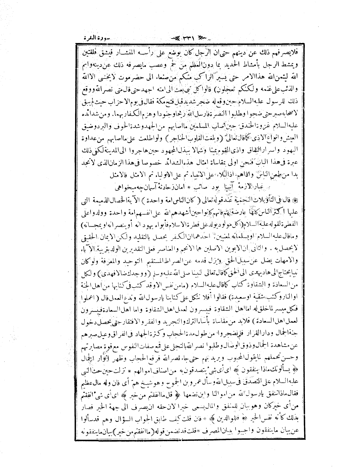 قال في التأويلات النجمية عند قوله تعالى كانَ النَّاسُ أُمَّةً واحِدَةً الآية الخصال الذميمة التي عليها اكثر الناس كلها عارضة لهم فانهم كانوا حين أشهدهم الله على أنفسهم امة واحدة وولد وأعلى الفطرة لقوله عليه السلام (كل مولود يولد على فطرة الإسلام فأبواه يهود انه أو ينصرانه او يمجسانه) وما قال عليه السلام او يسلمانه لمعنيين. أحدهما ان الكفر يحصل بالتقليد ولكن الايمان الحقيقي لا يحصل به. والثاني ان الأبوين الأصلين هما الأنجم والعناصر فعلى التقديرين الولد بتربية الآباء والأمهات يضل عن سبيل الحق ويزل قدمه عن الصراط المستقيم التوحيد والمعرفة ولو كان نبيا يحتاج الى هاد يهدى الى الحق كما قال تعالى لنبينا صلى الله عليه وسلم (وَوَجَدَكَ ضَالًّا فَهَدى) ولكل من السعادة والشقاوة كتاب كما قال عليه السلام (ما من نفس الا وقد كتب في كتابها من اهل الجنة او النار وكتب شقية او سعيدة) فقالوا أفلا نتكل على كتابنا يا رسول الله وندع العمل قال (اعملوا فكل ميسر لما خلق له اما اهل الشقاوة فييسرون لعمل اهل الشقاوة واما اهل السعادة فييسرون لعمل اهل السعادة) فلا بد من مقاساة بأساء الترك والتجريد والفقر والافتقار حتى يحصل دخول جنة الجمال ودار القرار فلم يضجروا من طول مدة الحجاب وكثرة الجهاد في الفراق وعيل صبرهم عن مشاهدة الجمال وذوق الوصال وطلبوا نصر الله بالتجلى على قمع صفات النفوس مع قوة مصابرتهم وحسن تحملهم لما يقول المحبوب ويريد بهم حتى جاء نصر الله فرفع الحجاب وظهر أنوار الجمال يَسْئَلُونَكَ ماذا يُنْفِقُونَ اى أي شىء يتصدقون به من اصناف أموالهم نزلت حين حث النبي عليه السلام على التصدق في سبيل الله وسأل عمرو بن الجموح وهو شيخ همّ أي فان وله مال عظيم فقال ماذا ننفق يا رسول الله من أموالنا واين نضعها قُلْ ما أَنْفَقْتُمْ مِنْ خَيْرٍ اى أي شىء أنفقتم من أي خير كان وهو بيان للمنفق والمال يسمى خيرا لان حقه ان يصرف الى جهة الخير فصار بذلك كأنه نفس الخير فَلِلْوالِدَيْنِ فان قلت كيف طابق الجواب السؤال وهم قد سألوا عن بيان ما ينفقون وأجيبوا ببيان المصرف قلت قد تضمن قوله ما أَنْفَقْتُمْ مِنْ خَيْرٍ بيان ما ينفقونه