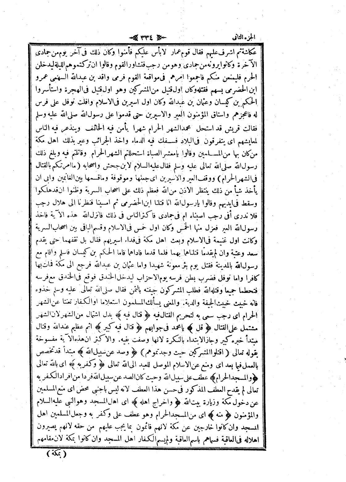 عكاشة ثم اشرف عليهم فقال قوم عمار لا بأس عليكم فأمنوا وكان ذلك في آخر يوم من جمادى الآخرة وكانوا يرونه من جمادى وهو من رجب فتشاور القوم وقالوا ان تركتموهم الليلة ليدخلن الحرم فليمنعن منكم فاجمعوا أمرهم في مواقعة القوم فرمى واقد بن عبد الله السهمي عمرو ابن الحضرمي بسهم فقتله وكان أول قتيل من المشركين وهو أول قتيل في الهجرة واستأسروا الحكم بن كيسان وعثمان بن عبد الله وكان أول اسيرين في الإسلام وأفلت نوفل على فرس له فاعجزهم واستاق المؤمنون العير والأسيرين حتى قدموا على رسول الله صلى الله عليه وسلم فقالت قريش قد استحل محمد الشهر الحرام شهرا يأمن فيه الخائف وينذعر فيه الناس لمعايشهم اى يتفرقون في البلاد فسفك فيه الدماء وأخذ الجرائب وعير بذلك اهل مكة من كان بها من المسلمين وقالوا يا معشر الصباة استحللتم الشهر الحرام وقاتلتم فيه وبلغ ذلك رسول الله صلى الله تعالى عليه وسلم فقال عليه السلام لابن جحش وأصحابه (ما أمرتكم بالقتال فى الشهر الحرام) ووقف العير والأسيرين اى جعلها وموقوفة وما قسمها بين الغانمين وابى ان يأخذ شيأ من ذلك ينتظر الاذن من الله فعظم ذلك على اصحاب السرية وظنوا ان قد هلكوا وسقط في أيديهم وقالوا يا رسول الله انا قتلنا ابن الحضرمي ثم أمسينا فنظرنا الى هلال رجب فلا ندرى أفي رجب أصبناه أم في جمادى فاكثر الناس في ذلك فانزل الله هذه الآية فاخذ رسول الله العير فعزل منها الخمس وكان أول خمس في الإسلام وقسم الباقي بين اصحاب السرية وكانت أول غنيمة في الإسلام وبعث اهل مكة في فداء اسيريهم فقال بل نقفهما حتى يقدم سعد وعتبة وان لم يقدما قتلناهما بهما فلما قدما فاداهما فاما الحكم بن كيسان فاسلم واقام مع رسول الله بالمدينة فقتل يوم بئر معونة شهيدا واما عثمان بن عبد الله فرجع الى مكة فمات بها كافرا واما نوفل فضرب بطن فرسه يوم الأحزاب ليدخل الخندق فوقع في الخندق مع فرسه فتحطما جميعا وقتله الله فطلب المشركون جيفته بالثمن فقال صلى الله تعالى عليه وسلم خذوه فانه خبيث خبيث الجيفة والدية. والمعنى يسألك المسلمون استعلاما او الكفار تعنتا عن الشهر الحرام اى رجب سمى به لتحريم القتال فيه قِتالٍ فِيهِ بدل اشتمال من الشهر لان الشهر مشتمل على القتال قُلْ يا محمد في جوابهم قِتالٌ فِيهِ كَبِيرٌ اثم عظيم عند الله وقتال مبتدأ خبره كبير وجاز الابتداء بالنكرة لانها وصفت بفيه. والأكثر ان هذه الآية مفسوخة بقوله تعالى فَاقْتُلُوا الْمُشْرِكِينَ حَيْثُ وَجَدْتُمُوهُمْ وَصَدٌّ عَنْ سَبِيلِ اللَّهِ مبتدأ قد تخصص بالعمل فيما بعد اى ومنع عن الإسلام الموصل للعبد الى الله تعالى وَكُفْرٌ بِهِ اى بالله تعالى وَالْمَسْجِدِ الْحَرامِ عطف على سبيل الله وحيث كان الصد عن سبيل الله فردا من افراد الكفر به تعالى لم يقدح العطف المذكور في حسن هذا العطف لانه ليس بأجنبي محض اى منع المسلمين عن دخول مكة وزيارة بيت الله وَإِخْراجُ أَهْلِهِ اى اهل المسجد وهو النبي عليه السلام والمؤمنون مِنْهُ اى من المسجد الحرام وهو عطف على وكفر به وجعل المسلمين اهل المسجد وان كانوا خارحين عن مكة لانهم قائمون بما يجب عليهم من حقه لانهم يصيرون أهلا له في العاقبة فسماهم باسم العاقبة ولم يسم الكفار اهل المسجد وان كانوا بمكة لان مقامهم
