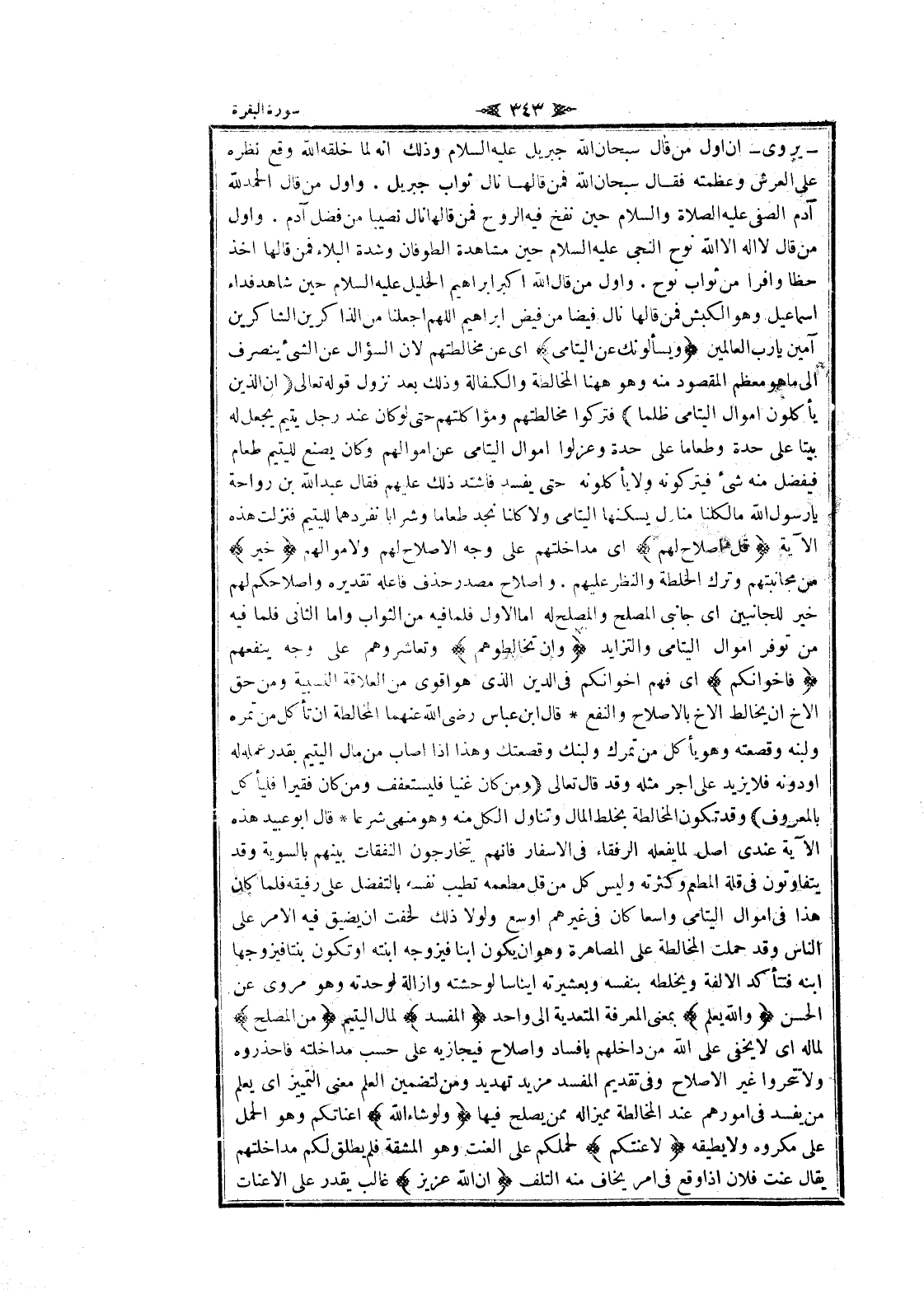 - يروى- ان أول من قال سبحان الله جبريل عليه السلام وذلك انه لما خلقه الله وقع نظره على العرش وعظمته فقال سبحان الله فمن قالها نال ثواب جبريل. وأول من قال الحمد لله آدم الصفي عليه الصلاة والسلام حين نفخ فيه الروح فمن قالها نال نصيبا من فضل آدم. وأول من قال لا اله الا الله نوح النجى عليه السلام حين مشاهدة الطوفان وشدة البلاء فمن قالها أخذ حظا وافرا من ثواب نوح. وأول من قال الله اكبر ابراهيم الخليل عليه السلام حين شاهد فداء إسماعيل وهو الكبش فمن قالها نال فيضا من فيض ابراهيم اللهم اجعلنا من الذاكرين الشاكرين آمين يا رب العالمين وَيَسْئَلُونَكَ عَنِ الْيَتامى اى عن مخالطتهم لان السؤال عن الشيء ينصرف الى ما هو معظم المقصود منه وهو هاهنا المخالطة والكفالة وذلك بعد نزول قوله تعالى إِنَّ الَّذِينَ يَأْكُلُونَ أَمْوالَ الْيَتامى ظُلْماً فتركوا مخالطتهم ومؤاكلتهم حتى لو كان عند رجل يتيم يجعل له بيتا على حدة وطعاما على حدة وعزلوا اموال اليتامى عن أموالهم وكان يصنع لليتيم طعام فيفضل منه شىء فيتركونه ولا يأكلونه حتى يفسد فاشتد ذلك عليهم فقال عبد الله بن رواحة يا رسول الله مالكلنا منازل يسكنها اليتامى ولا كلنا نجد طعاما وشرابا نفردهما لليتيم فنزلت هذه الآية قُلْ إِصْلاحٌ لَهُمْ اى مداخلتهم على وجه الإصلاح لهم ولاموالهم خَيْرٌ من مجانبتهم وترك الخلطة والنظر عليهم. وإصلاح مصدر حذف فاعله تقديره وإصلاحكم لهم خير للجانبين اى جانبى المصلح والمصلح له اما الاول فلما فيه من الثواب واما الثاني فلما فيه من توفر اموال اليتامى والتزايد وَإِنْ تُخالِطُوهُمْ وتعاشروهم على وجه ينفعهم فَإِخْوانُكُمْ اى فهم إخوانكم في الدين الذي هو أقوى من العلاقة النسبية ومن حق الأخ ان يخالط الأخ بالإصلاح والنفع قال ابن عباس رضي الله عنهما المخالطة ان تأكل من تمره ولبنه وقصعته وهو يأكل من تمرك ولبنك وقصعتك وهذا إذا أصاب من مال اليتيم بقدر عمله له او دونه فلا يزيد على اجر مثله وقد قال تعالى وَمَنْ كانَ غَنِيًّا فَلْيَسْتَعْفِفْ وَمَنْ كانَ فَقِيراً فَلْيَأْكُلْ بِالْمَعْرُوفِ وقد تكون المخالطة بخلط المال وتناول الكل منه وهو منهى شرعا قال ابو عبيد هذه الآية عندى اصل لما يفعله الرفقاء في الاسفار فانهم يتخارجون النفقات بينهم بالسوية وقد يتفاوتون في قلة المطعم وكثرته وليس كل من قل مطعمه تطيب نفسه بالتفضل على رفيقه فلما كان هذا في اموال اليتامى واسعا كان في غيرهم أوسع ولولا ذلك لخفت ان يضيق فيه الأمر على الناس وقد حملت المخالطة على المصاهرة وهو ان يكون ابنا فيزوجه ابنته او تكون بنتا فيزوجها ابنه فتتأكد الالفة ويخلطه بنفسه وبعشيرته إيناسا لوحشته وازالة لوحدته وهو مروى عن الحسن وَاللَّهُ يَعْلَمُ بمعنى المعرفة المتعدية الى واحد الْمُفْسِدَ لمال اليتيم مِنَ الْمُصْلِحِ لماله اى لا يخفى على الله من داخلهم بإفساد وإصلاح فيجازيه على حسب مداخلته فاحذروه ولا تتحروا غير الإصلاح وفي تقديم المفسد مزيد تهديد ومن لتضمين العلم معنى التمييز اى يعلم من يفسد في أمورهم عند المخالطة مميزا له ممن يصلح فيها وَلَوْ شاءَ اللَّهُ اعناتكم وهو الحمل على مكروه ولا يطيقه لَأَعْنَتَكُمْ لحملكم على العنت وهو المشقة فلم يطلق لكم مداخلتهم يقال عنت فلان إذا وقع في امر يخاف منه التلف إِنَّ اللَّهَ عَزِيزٌ غالب يقدر على الاعنات