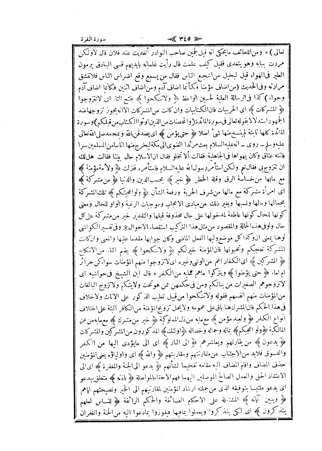 تعالى) ومن اللطائف ما يحكى انه قيل لجمين صاحب النوادر أتغديت عند فلان قال لا ولكن مررت ببابه وهو يتغدى فقيل كيف علمت قال رأيت غلمانه بايديهم قسى البنادق يرمون الطير في الهواء قيل لبخيل من أشجع الناس فقال من يسمع وقع اضراس الناس فلا تنشق مرارته وفي الحديث (من أضاف مؤمنا فكأنما أضاف آدم ومن أضاف اثنين فكانما أضاف آدم وحواء) كذا في الرسالة العلية لحسين الواعظ وَلا تَنْكِحُوا بفتح التاء اى لا تتزوجوا الْمُشْرِكاتِ اى الحربيات فان الكتابيات وان كانت من المشركات الا انه يجوز تزوجها عند الجمهور استدلالا بقوله تعالى في سورة المائدة وَالْمُحْصَناتُ مِنَ الَّذِينَ أُوتُوا الْكِتابَ مِنْ قَبْلِكُمْ وسورة المائدة كلها ثابتة لم ينسخ منها شىء أصلا حَتَّى يُؤْمِنَّ اى يصدقن بالله وبمحمد صلى الله تعالى عليه وسلم- روى- انه عليه السلام بعث مرثدا الغنوي الى مكة ليخرج منها أناسا من المسلمين سرا فاتته عتاق وكان يهواها في الجاهلية فقالت ألا تخلو فقال ان الإسلام حال بيننا فقالت هل لك ان تتزوج بي فقال نعم ولكن استأمر رسول الله عليه السلام فاستأمره فنزلت وَلَأَمَةٌ مُؤْمِنَةٌ مع ما بها من خساسة الرق وقلة الخطر خَيْرٌ بحسب الدين والدنيا مِنْ مُشْرِكَةٍ اى امرأة مشركة مع مالها من شرف الحرية ورفعة الشأن وَلَوْ أَعْجَبَتْكُمْ تلك المشركة بجمالها ومالها ونسبها وبغير ذلك من مبادى الاعجاب وموجبات الرغبة والواو للحال ومعنى كونها للحال كونها عاطفة لمدخولها على حال محذوفة قبلها والتقدير خير من مشركة على كل حال ولو في هذه الحالة والمقصود من مثل هذا التركيب استقصاء الأحوال وفي تفسير الكواشي لو هنا بمعنى ان وكذا كل موضع وليها الفعل الماضي وكان جوابها مقدما عليها والمعنى وان كانت المشركة تعجبكم وتحبونها فان المؤمنة خير لكم وَلا تَنْكِحُوا بضم التاء من الانكاح الْمُشْرِكِينَ اى الكفار أعم من الوثني وغيره اى لا تزوجوا منهم المؤمنات سواء كن حرائر أم إماء حَتَّى يُؤْمِنُوا ويتركوا ما هم عليه من الكفر قال ابن الشيخ في حواشيه اى لا تزوجوهم الصغيرات من بناتكم ومن في حكمهن ممن هو تحت ولايتكم ولا تزوج البالغات من المؤمنات منهم أنفسهم فقوله ولا تنكحوا من قبيل تغليب الذكور على الإناث ولا خلاف فى هذا الحكم فان المشرك هنا باق على عمومه ولا يحل تزويج المؤمنة من الكافر البتة على اختلاف انواع الكفر وَلَعَبْدٌ مُؤْمِنٌ مع ما به من ذل المملوكية خَيْرٌ مِنْ مُشْرِكٍ مع ما به من عز المالكية وَلَوْ أَعْجَبَكُمْ بماله وجماله وخصاله أُولئِكَ المذكورون من المشركين والمشركات يَدْعُونَ من يقارنهم ويعاشرهم إِلَى النَّارِ اى الى ما يؤدى إليها من الكفر والفسوق فلابد من الاجتناب عن مقارنتهم ومقاربتهم وَاللَّهُ اى وأولياؤه يعنى المؤمنين حذف المضاف واقام المضاف اليه مقامه تفخيما لشأنهم يَدْعُوا إِلَى الْجَنَّةِ وَالْمَغْفِرَةِ اى الى الاعتقاد الحق والعمل الصالح الموصلين إليهما فهم الاحقاء بالمواصلة بِإِذْنِهِ متعلق بيدعو اى يدعو ملتبسا بتوفيقه الذي من جملته ارشاد المؤمنين لمقارنيهم الى الخير ونصيحتهم إياهم وَيُبَيِّنُ آياتِهِ المشتملة على الاحكام الفائقة والحكم الرائقة لِلنَّاسِ لَعَلَّهُمْ يَتَذَكَّرُونَ اى لكى يتذكروا ويعملوا بما فيها فيفوزوا بما دعوا اليه من الجنة والغفران