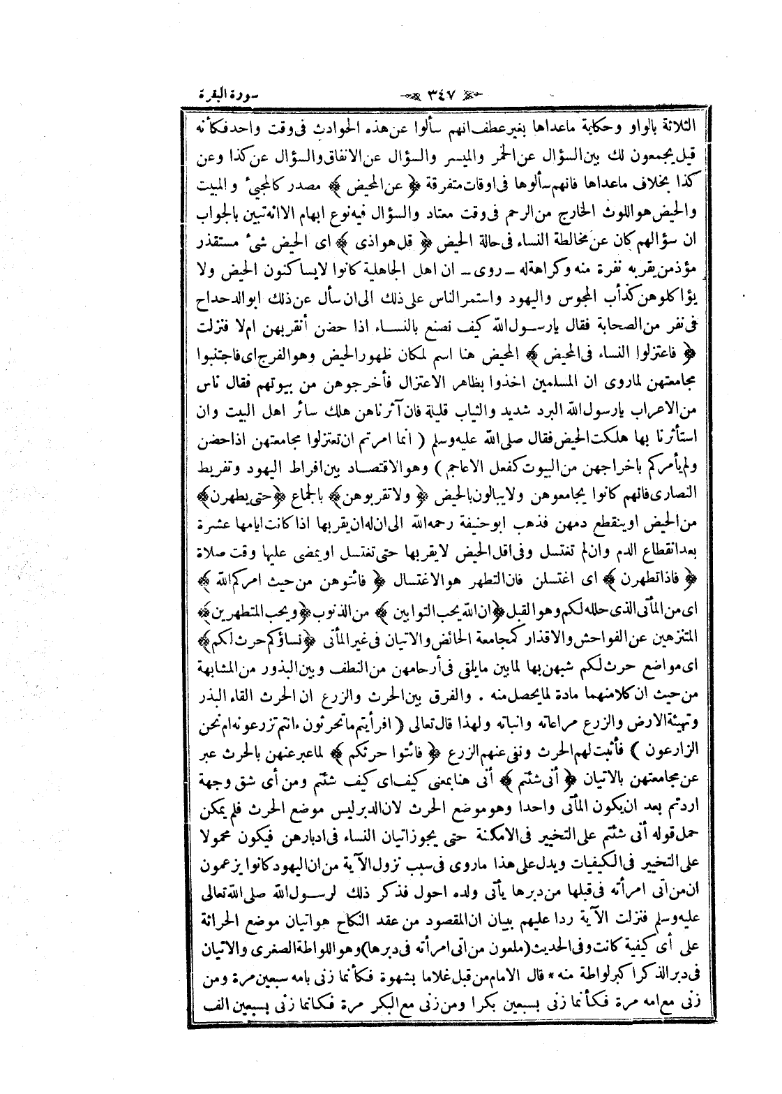 الثلاثة بالواو وحكاية ما عداها بغير عطف انهم سألوا عن هذه الحوادث في وقت واحد فكأنه قيل يجمعون لك بين السؤال عن الخمر والميسر والسؤال عن الانفاق والسؤال عن كذا وعن كذا بخلاف ما عداها فانهم سألوها في اوقات متفرقة عَنِ الْمَحِيضِ مصدر كالمجيئ والمبيت والحيض هو اللوث الخارج من الرحم في وقت معتاد والسؤال فيه نوع إبهام الا انه تبين بالجواب ان سؤالهم كان عن مخالطة النساء في حالة الحيض قُلْ هُوَ أَذىً اى الحيض شىء مستقذر مؤذ من يقربه نفرة منه وكراهة له- روى- ان اهل الجاهلية كانوا لا يساكنون الحيض ولا يؤاكلوهن كدأب المجوس واليهود واستمر الناس على ذلك الى ان سأل عن ذلك أبو الدحداح فى نفر من الصحابة فقال يا رسول الله كيف نصنع بالنساء إذا حضن أنقربهن أم لا فنزلت فَاعْتَزِلُوا النِّساءَ فِي الْمَحِيضِ المحيض هنا اسم لمكان ظهور الحيض وهو الفرج اى فاجتنبوا مجامعتهن لما روى ان المسلمين أخذوا بظاهر الاعتزال فأخرجوهن من بيوتهم فقال ناس من الاعراب يا رسول الله البرد شديد والثياب قليلة فان آثرناهن هلك سائر اهل البيت وان استأثرنا بها هلكت الحيض فقال صلى الله عليه وسلم (انما أمرتم ان تعتزلوا مجامعتهن إذا حضن ولم يأمركم باخراجهن من البيوت كفعل الأعاجم) وهو الاقتصاد بين افراط اليهود وتفريط النصارى فانهم كانوا يجامعوهن ولا يبالون بالحيض وَلا تَقْرَبُوهُنَّ بالجماع حَتَّى يَطْهُرْنَ من الحيض او ينقطع دمهن فذهب ابو حنيفة رحمه الله الى ان له ان يقربها إذا كانت أيامها عشرة بعد انقطاع الدم وان لم تغتسل وفي اقل الحيض لا يقربها حتى تغتسل او يمضى عليها وقت صلاة فَإِذا تَطَهَّرْنَ اى اغتسلن فان التطهر هو الاغتسال فَأْتُوهُنَّ مِنْ حَيْثُ أَمَرَكُمُ اللَّهُ اى من المأتى الذي حلله لكم وهو القبل إِنَّ اللَّهَ يُحِبُّ التَّوَّابِينَ من الذنوب وَيُحِبُّ الْمُتَطَهِّرِينَ المتنزهين عن الفواحش والاقذار كمجامعة الحائض والإتيان في غير المأتى نِساؤُكُمْ حَرْثٌ لَكُمْ اى مواضع حرث لكم شبهن بها لما بين ما يلقى في أرحامهن من النطف وبين البذور من المشابهة من حيث ان كلا منهما مادة لما يحصل منه. والفرق بين الحرث والزرع ان الحرث إلقاء البذر وتهيئة الأرض والزرع مراعاته وانباته ولهذا قال تعالى أَفَرَأَيْتُمْ ما تَحْرُثُونَ أَأَنْتُمْ تَزْرَعُونَهُ أَمْ نَحْنُ الزَّارِعُونَ فأثبت لهم الحرث ونفى عنهم الزرع فَأْتُوا حَرْثَكُمْ لما عبر عنهن بالحرث عبر عن مجامعتهن بالإتيان أَنَّى شِئْتُمْ أنى هنا بمعنى كيف اى كيف شئتم ومن أي شق وجهة أردتم بعد ان يكون المأتى واحدا وهو موضع الحرث لان الدبر ليس موضع الحرث فلم يمكن حمل قوله أنى شئتم على التخيير في الامكنة حتى يجوز إتيان النساء في أدبارهن فيكون محمولا على التخيير في الكيفيات ويدل على هذا ما روى في سبب نزول الآية من ان اليهود كانوا يزعمون ان من اتى امرأته في قبلها من دبرها يأتى ولده أحول فذكر ذلك لرسول الله صلى الله تعالى عليه وسلم فنزلت الآية ردا عليهم ببيان ان المقصود من عقد النكاح هو إتيان موضع الحراثة على أي كيفية كانت وفي الحديث (ملعون من اتى امرأته في دبرها) وهو اللواطة الصغرى والإتيان فى دبر الذكر اكبر لواطة منه قال الامام من قبل غلاما بشهوة فكأنما زنى بامه سبعين مرة ومن زنى مع امه مرة فكأنما زنى بسبعين بكرا ومن زنى مع البكر مرة فكانما زنى بسبعين الف
