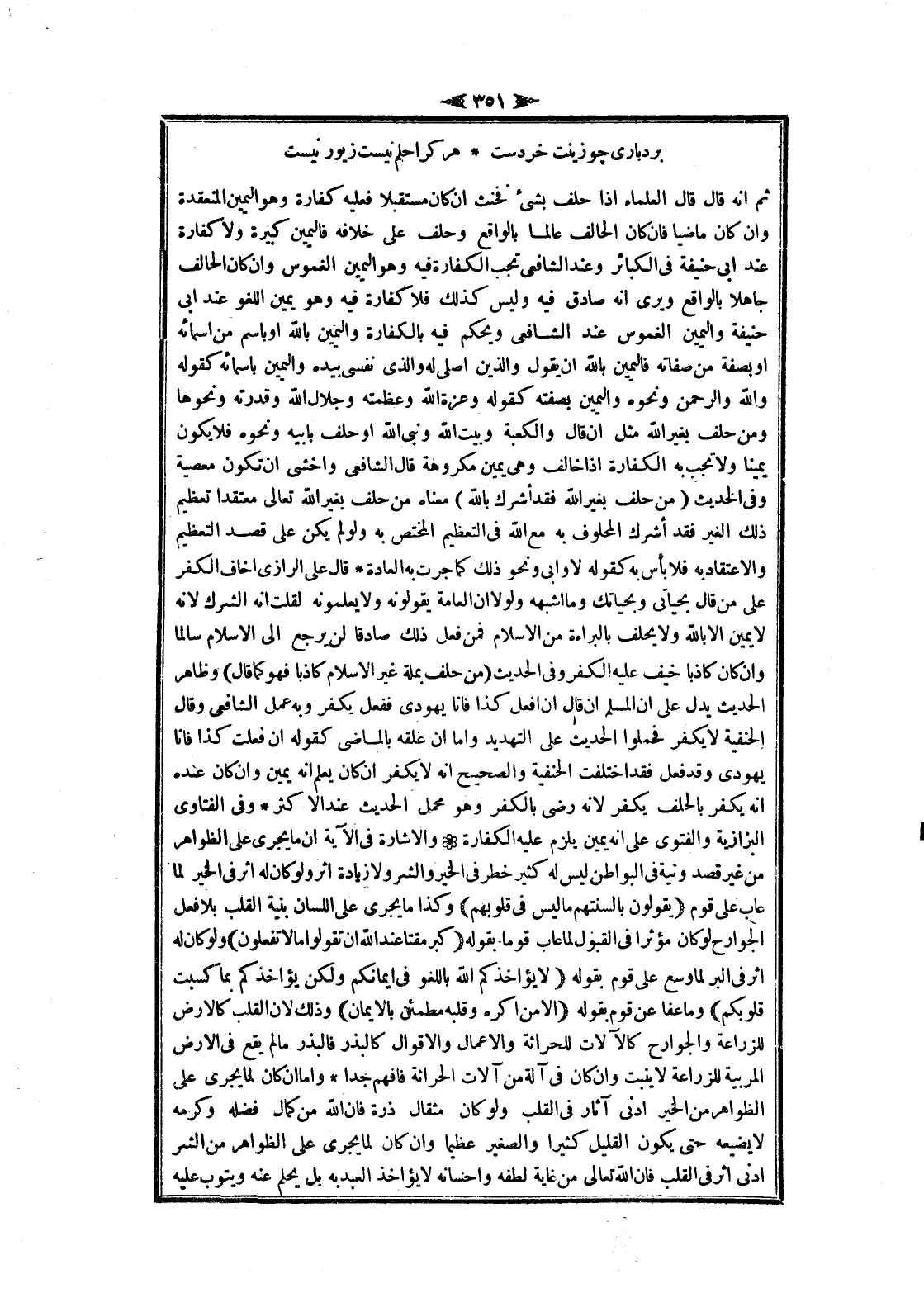 وقدرته ونحوها ومن حلف بغير الله مثل ان قال والكعبة وبيت الله ونبى الله او حلف بابيه ونحوه فلا يكون يمينا ولا تجب به الكفارة إذا خالف وهي يمين مكروهة قال الشافعي وأخشى ان تكون معصية وفي الحديث (من حلف بغير الله فقد أشرك بالله) معناه من حلف بغير الله تعالى معتقدا تعظيم ذلك الغير فقد أشرك المحلوف به مع الله في التعظيم المختص به ولو لم يكن على قصد التعظيم والاعتقاد به فلا بأس به كقوله لا وابى ونحو ذلك كما جرت به العادة قال على الرازي أخاف الكفر على من قال بحياتي وبحياتك وما أشبهه ولولا ان العامة يقولونه ولا يعلمونه لقلت انه الشرك لانه لا يمين الا بالله ولا يحلف بالبراءة من الإسلام فمن فعل ذلك صادقا لن يرجع الى الإسلام سالما وان كان كاذبا خيف عليه الكفر وفي الحديث (من حلف بملة غير الإسلام كاذبا فهو كما قال) وظاهر الحديث يدل على ان المسلم ان قال ان افعل كذا فانا يهودى ففعل يكفر وبه عمل الشافعي وقال الحنفية لا يكفر فحملوا الحديث على التهديد واما ان علقه بالماضي كقوله ان فعلت كذا فانا يهودى وقد فعل فقد اختلفت الحنفية والصحيح انه لا يكفر ان كان يعلم انه يمين وان كان عنده انه يكفر بالحلف يكفر لانه رضى بالكفر وهو محمل الحديث عند الأكثر وفي الفتاوى البزازية والفتوى على انه يمين يلزم عليه الكفارة والاشارة في الآية ان ما يجرى على الظواهر من غير قصد ونية في البواطن ليس له كثير خطر في الخير والشر ولا زيادة اثر ولو كان له اثر في الخير لما عاب على قوم يَقُولُونَ بِأَلْسِنَتِهِمْ ما لَيْسَ فِي قُلُوبِهِمْ وكذا ما يجرى على اللسان بنية القلب بلا فعل الجوارح لو كان مؤثرا في القبول لما عاب قوما بقوله كَبُرَ مَقْتاً عِنْدَ اللَّهِ أَنْ تَقُولُوا ما لا تَفْعَلُونَ ولو كان له اثر في البر لما وسع على قوم بقوله لا يُؤاخِذُكُمُ اللَّهُ بِاللَّغْوِ فِي أَيْمانِكُمْ وَلكِنْ يُؤاخِذُكُمْ بِما كَسَبَتْ قُلُوبُكُمْ وما عفا عن قوم بقوله إِلَّا مَنْ أُكْرِهَ وَقَلْبُهُ مُطْمَئِنٌّ بِالْإِيمانِ وذلك لان القلب كالارض للزراعة والجوارح كالآلات للحراثة والأعمال والأقوال كالبذر فالبذر ما لم يقع في الأرض المربية للزراعة لا ينبت وان كان في آلة من آلات الحراثة فافهم جدا واما ان كان لما يجرى على الظواهر من الخير ادنى آثار في القلب ولو كان مثقال ذرة فان الله من كمال فضله وكرمه لا يضيعه حتى يكون القليل كثيرا والصغير عظيما وان كان لما يجرى على الظواهر من الشر ادنى اثر في القلب فان الله تعالى من غاية لطفه وإحسانه لا يؤاخذ العبد به بل يحلم عنه ويتوب عليه