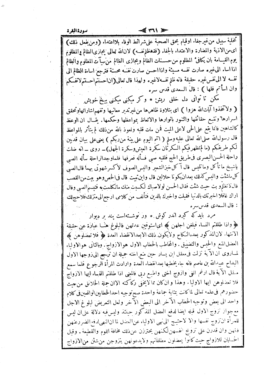 تخلية سبيل من غير جفاء او قيام بحق الصحبة على شرائط الوفاء بلا اعتداء وَمَنْ يَفْعَلْ ذلِكَ اى من الاذية والمضارة والاعتداء بالجفاء فَقَدْ ظَلَمَ نَفْسَهُ لان الله تعالى يجازى الظالم والمظلوم يوم القيامة بان يكافئ المظلوم من حسنات الظالم ويجازى الظالم من سيآت المظلوم والظالم إذا أساء الى غيره صارت نفسه مسيئة وإذا احسن صارت نفسه محسنة فترجع اساءة الظالم الى نفسه لا الى نفس غيره حقيقة فانه ظلم نفسه لا غيره ولهذا قال تعالى إِنْ أَحْسَنْتُمْ أَحْسَنْتُمْ لِأَنْفُسِكُمْ وَإِنْ أَسَأْتُمْ فَلَها: قال السعدي قدس سره