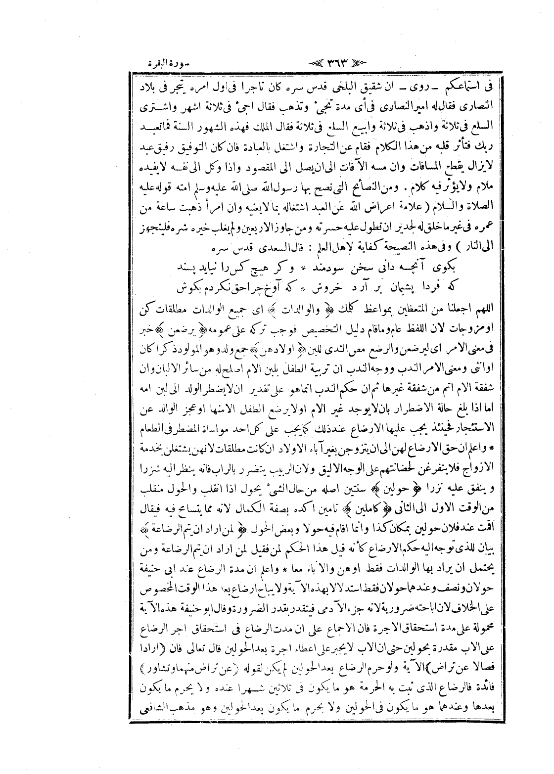 اللهم اجعلنا من المتعظين بمواعظ كلمك وَالْوالِداتُ اى جميع الوالدات مطلقات كن او مزوجات لان اللفظ عام وما قام دليل التخصيص فوجب تركه على عمومه يُرْضِعْنَ خبر فى معنى الأمر اى ليرصعن والرضع مص الثدي للبن أَوْلادَهُنَّ جمع ولد وهو المولود ذكرا كان او أنثى ومعنى الأمر الندب ووجه الندب ان تربية الطفل بلبن الام أصلح له من سائر الألبان وان شفقة الام أتم من شفقة غيرها ثم ان حكم الندب انما هو على تقدير ان لا يضطر الولد الى لبن امه اما إذا بلغ حالة الاضطرار بان لا يوجد غير الام او لا يرضع الطفل الا منها او عجز الوالد عن الاستئجار فحينئذ يجب عليها الإرضاع عند ذلك كما يجب على كل أحد مواساة المضطر في الطعام واعلم ان حق الإرضاع لهن الى ان يتزوجن بغير آباء الأولاد ان كانت مطلقات لانهن يشتغلن بخدمة الأزواج فلا يتفرغن لحضانتهم على الوجه الأليق ولان الربيب يتضرر بالراب فانه ينظر اليه شزرا وينفق عليه نزرا حَوْلَيْنِ سنتين أصله من حال الشيء يحول إذا انقلب والحول منقلب من الوقت الاول الى الثاني كامِلَيْنِ تامين أكده بصفة الكمال لانه مما يتسامح فيه فيقال أقمت عند فلان حولين بمكان كذا وانما اقام فيه حولا وبعض الحول لِمَنْ أَرادَ أَنْ يُتِمَّ الرَّضاعَةَ بيان للذى توجه اليه حكم الإرضاع كأنه قيل هذا الحكم لمن فقيل لمن أراد ان يتم الرضاعة ومن يحتمل ان يراد بها الوالدات فقط او هن والآباء معا واعلم ان مدة الرضاع عند ابى حنيفة حولان ونصف وعندهما حولان فقط استدلالا بهذه الآية ولا يباح إرضاع بعد هذا الوقت المخصوص على الخلاف لان اباحته ضرورية لانه جزء الآدمي فيتقدر بقدر الضرورة وقال ابو حنيفة هذه الآية محمولة على مدة استحقاق الاجرة فان الإجماع على ان مدت الرضاع في استحقاق اجر الرضاع على الأب مقدرة بحولين حتى ان الأب لا يجبر على إعطاء اجرة بعد الحولين قال تعالى فان أَرادا فِصالًا عَنْ تَراضٍ الآية ولو حرم الرضاع بعد الحولين لم يكن لقوله عَنْ تَراضٍ مِنْهُما وَتَشاوُرٍ فائدة فالرضاع الذي ثبت به الحرمة هو ما يكون في ثلاثين شهرا عنده ولا يحرم ما يكون بعدها وعندهما هو ما يكون في الحولين ولا يحرم ما يكون بعد الحولين وهو مذهب الشافعي