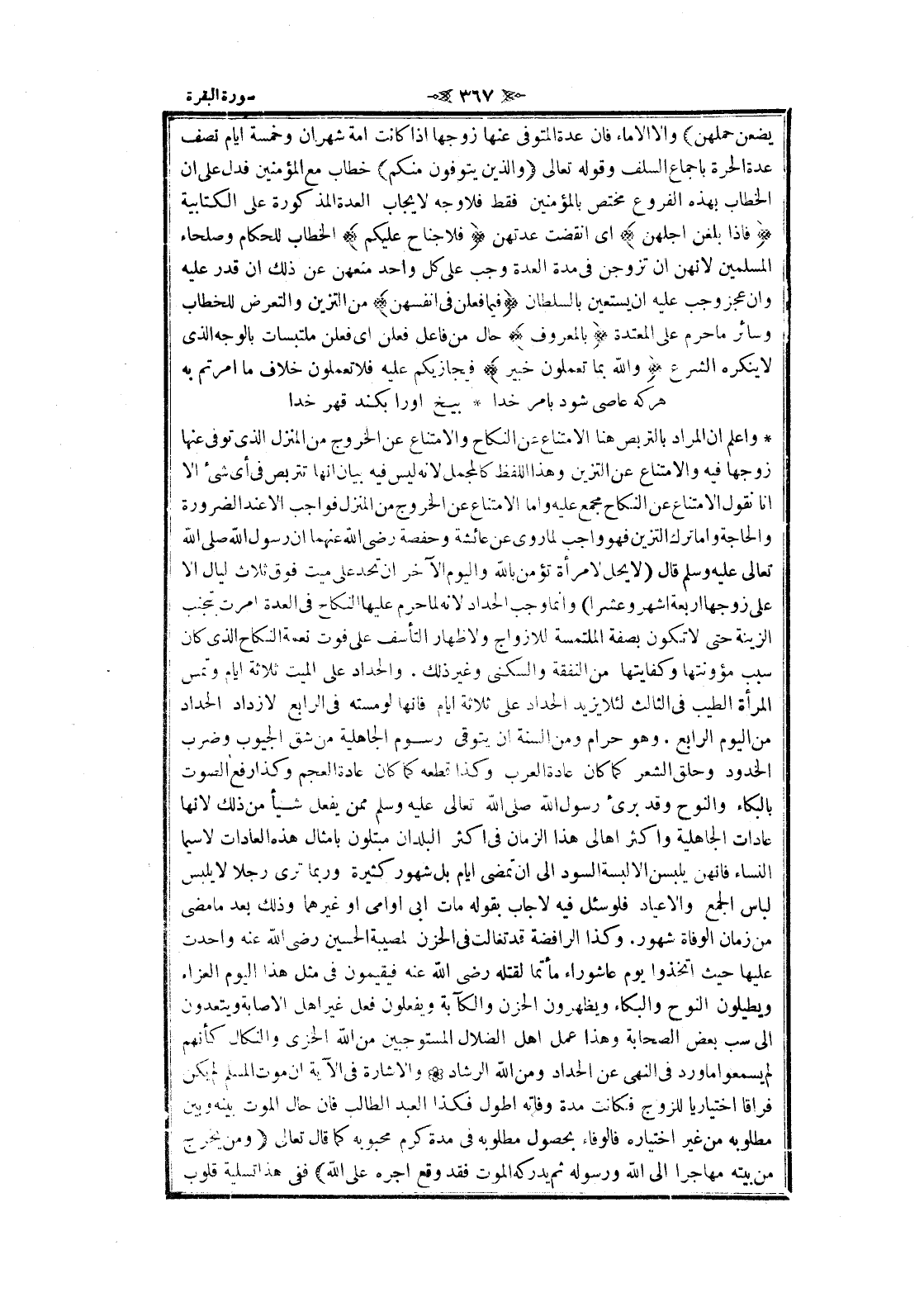 الرابع لازداد الحداد من اليوم الرابع. وهو حرام ومن السنة ان يتوقى رسوم الجاهلية من شق الجيوب وضرب الخدود وحلق الشعر كما كان عادة العرب وكذا قطعه كما كان عادة العجم وكذا رفع الصوت بالبكاء والنوح وقد برئ رسول الله صلى الله تعالى عليه وسلم ممن يفعل شيأ من ذلك لانها عادات الجاهلية واكثر اهالى هذا الزمان في اكثر البلدان مبتلون بامثال هذه العادات لا سيما النساء فانهن يلبسن الالبسة السود الى ان تمضى ايام بل شهور كثيرة وربما ترى رجلا لا يلبس لباس الجمع والأعياد فلو سئل فيه لاجاب بقوله مات ابى او أمي او غيرهما وذلك بعد ما مضى من زمان الوفاة شهور. وكذا الرافضة قد تغالت في الحزن لمصيبة الحسين رضي الله عنه واحدت عليها حيث اتخذوا يوم عاشوراء مأتما لقتله رضي الله عنه فيقيمون في مثل هذا اليوم العزاء ويطيلون النوح والبكاء ويظهرون الحزن والكآبة ويفعلون فعل غير اهل الاصابة ويتعدون الى سب بعض الصحابة وهذا عمل اهل الضلال المستوجبين من الله الخزي والنكال كأنهم لم يسمعوا ما ورد في النهى عن الحداد ومن الله الرشاد والاشارة في الآية ان موت المسلم لم يكن فراقا اختياريا للزوج فكانت مدة وفاته أطول فكذا العبد الطالب فان حال الموت بينه وبين مطلوبه من غير اختياره فالوفاء بحصول مطلوبه في مدة كرم محبوبه كما قال تعالى وَمَنْ يَخْرُجْ مِنْ بَيْتِهِ مُهاجِراً إِلَى اللَّهِ وَرَسُولِهِ ثُمَّ يُدْرِكْهُ الْمَوْتُ فَقَدْ وَقَعَ أَجْرُهُ عَلَى اللَّهِ ففى هذا تسلية قلوب