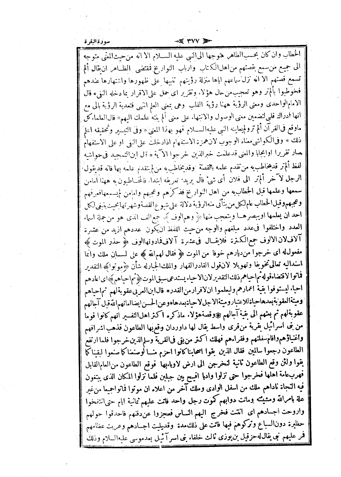 الخطاب وان كان بحسب الظاهر متوجها الى النبي عليه السلام الا انه من حيث المعنى متوجه الى جميع من سمع بقصتهم من اهل الكتاب وارباب التواريخ فمقتضى الظاهر ان يقال ألم تسمع قصتهم الا انه نزل سماعهم إياها منزلة رؤيتهم تنبيها على ظهورها واشتهارها عندهم فخوطبوا بألم تر وهو تعجيب من حال هؤلاء وتقرير اى حمل على الإقرار بما دخله النفي قال الامام الواحدي ومعنى الرؤية هاهنا رؤية القلب وهي بمعنى العلم انتهى فتعدية الرؤية بالى مع انها ادراك قلبى لتضمين معنى الوصول والانتهاء على معنى ألم ينته علمك إليهم قال العلماء كل ما وقع في القرآن ألم تر ولم يعاينه النبي عليه السلام فهو بهذا المعنى وفي التيسير وتحقيقه اعلم ذلك وفي الكواشي معناه الوجوب لان همزة الاستفهام إذا دخلت على النفي او على الاستفهام صار تقريرا او إيجابا والمعنى قد علمت خبر الذين خرجوا الآية قال ابن التمجيد في حواشيه لفظ ألم تر قد يخاطب به من تقدم علمه بالقصة وقد يخاطب به من لم يتقدم علمه بها فانه قد يقول الرجل لآخر ألم تر الى فلان أي شىء قال يريد تعريفه ابتداء فالمخاطبون به هاهنا اما من سمعها وعلمها قبل الخطاب به من اهل التواريخ فذكرهم وعجبهم واما من لم يسمعها فعرفهم وعجبهم وقيل الخطاب عام لكل من يتأتى منه الرؤية دلالة على شيوع القصة وشهرتها بحيث ينبغى لكل أحد ان يعلمها او يبصرها ويتعجب منها وَهُمْ أُلُوفٌ جمع الف الذي هو من جملة اسماء العدد واختلفوا في عدد مبلغهم والوجه من حيث اللفظ ان يكون عددهم أزيد من عشرة آلاف لان الألوف جمع الكثرة فلا يقال في عشرة آلاف فما دونها ألوف حَذَرَ الْمَوْتِ مفعول له اى خرجوا من ديارهم خوفا من الموت فَقالَ لَهُمُ اللَّهُ على لسان ملك وانما أسند اليه تعالى تخويفا وتهويلا لان قول القادر القهار والملك الجبار له شأن مُوتُوا التقدير فماتوا لاقتضاء قوله ثم أحياهم ذلك التقدير لان الاحياء يستدعى سبق الموت ثُمَّ أَحْياهُمْ اى أعادهم احياء ليستوفوا بقية أعمارهم وليعلموا ان لا فرار من القدر قال ابن العربي عقوبة لهم ثم أحياهم وميتة العقوبة بعدها حياة للاعتبار وميتة الاجل لا حياة بعدها وعن الحسن ايضا أماتهم الله قبل آجالهم عقوبة لهم ثم بعثهم الى بقية آجالهم وقصة هؤلاء ما ذكره اكثر اهل التفسير انهم كانوا قوما من بنى إسرائيل بقرية من قرى واسط يقال لها داوردان وقع بها الطاعون فذهب اشرافهم واغنياؤهم واقام سفلتهم وفقراءهم فهلك اكثر من بقي في القرية وسلم الذين خرجوا فلما ارتفع الطاعون رجعوا سالمين فقال الذين بقوا أصحابنا كانوا احزم منا لو صنعنا كما صنعوا لبقينا كما بقوا ولئن وقع الطاعون ثانية لنخرجن الى ارض لا وباء بها فوقع الطاعون من العام القابل فهرب عامة أهلها فخرجوا حتى نزلوا واديا افيح بين جبلين فلما نزلوا المكان الذي يبتغون فيه النجاة ناداهم ملك من أسفل الوادي وملك آخر من أعلاه ان موتوا فماتوا جميعا من غير علة بامر الله ومشيئته وماتت دوابهم كموت رجل واحد فاتت عليهم ثمانية ايام حتى انتفخوا وأروحت أجسادهم اى أنتنت فخرج إليهم الناس فعجزوا عن دفنهم فاحدقوا حولهم حظيرة دون السباع وتركوهم فيها فاتت على ذلك مدة وقد بليت أجسادهم وعريت عظامهم فمر عليهم نبى يقال له حزقيل بن يوزى ثالث خلفاء بنى إسرائيل بعد موسى عليه السلام وذلك