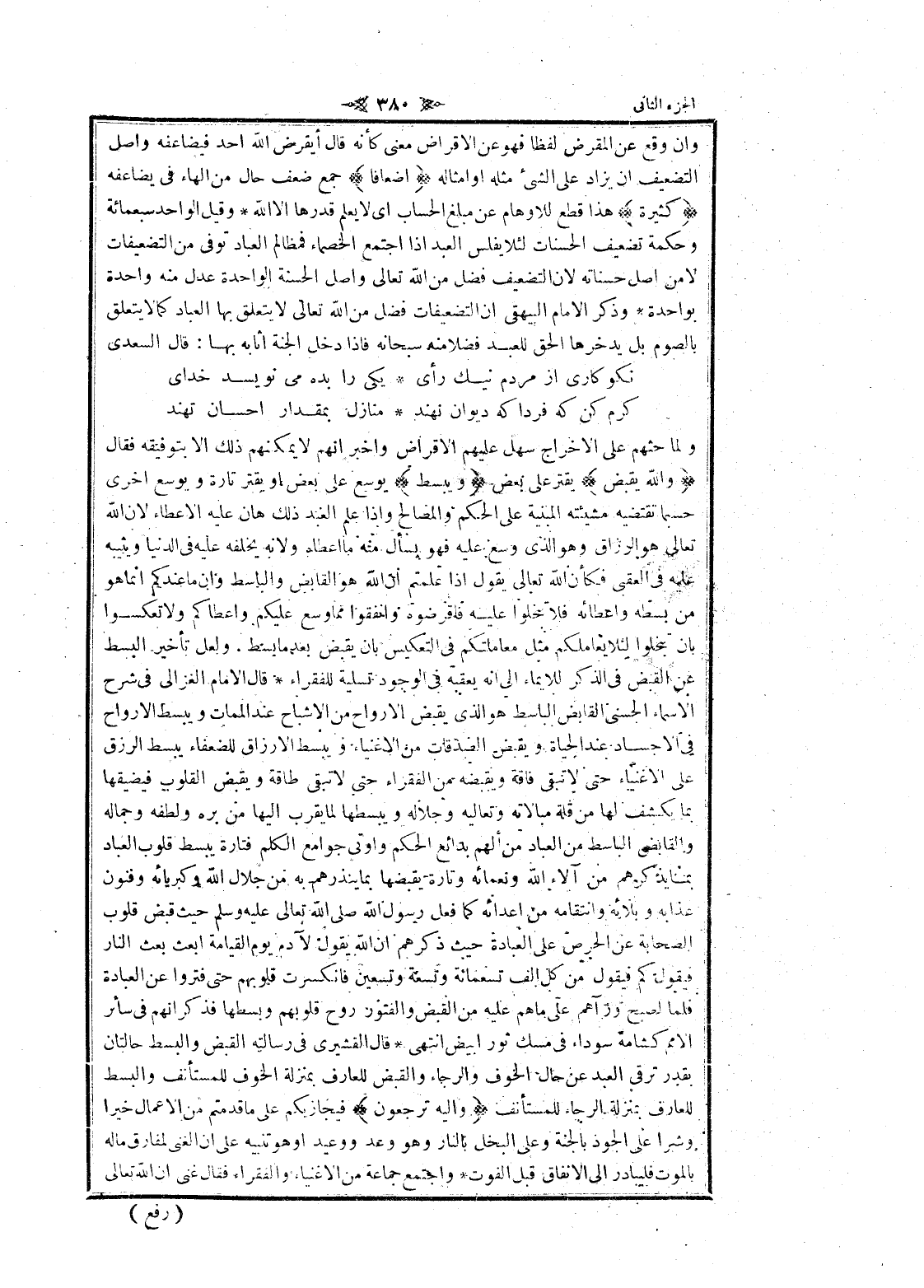 ولما حثهم على الإخراج سهل عليهم الاقراض واخبر انهم لا يمكنهم ذلك الا بتوفيقه فقال وَاللَّهُ يَقْبِضُ يقتر على بعض وَيَبْصُطُ يوسع على بعض او يقتر تارة ويوسع اخرى حسبما تقتضيه مشيئته المبنية على الحكم والمصالح وإذا علم العبد ذلك هان عليه الإعطاء لان الله تعالى هو الرزاق وهو الذي وسع عليه فهو يسأل منه ما أعطاه ولانه يخلفه عليه في الدنيا ويثيبه عليه في العقبى فكأن الله تعالى يقول إذا علمتم ان الله هو القابض والباسط وان ما عندكم انما هو من بسطه وإعطائه فلا تبخلوا عليه فاقرضوه وأنفقوا مما وسع عليكم واعطاكم ولا تعكسوا بان تبخلوا لئلا يعاملكم. مثل معاملتكم في التعكيس بان يقبض بعد ما بسط. ولعل تأخير البسط عن القبض في الذكر للايماء الى انه يعقبه في الوجود تسلية للفقراء قال الامام الغزالي في شرح الأسماء الحسنى القابض الباسط هو الذي يقبض الأرواح من الأشباح عند الممات ويبسط الأرواح فى الأجساد عند الحياة ويقبض الصدقات من الأغنياء ويبسط الأرزاق للضعفاء يبسط الرزق على الأغنياء حتى لا تبقى فاقة ويقبضه من الفقراء حتى لا تبقى طاقة ويقبض القلوب فيضيقها مما يكشف لها من قلة مبالاته وتعاليه وجلاله ويبسطها لما يقرب إليها من بره ولطفه وجماله والقابض الباسط من العباد من ألهم بدائع الحكم واوتى جوامع الكلم فتارة يبسط قلوب العباد بما يذكرهم من آلاء الله ونعمائه وتارة يقبضها بما ينذرهم به من جلال الله وكبريائه وفنون عذابه وبلائه وانتقامه من أعدائه كما فعل رسول الله صلى الله تعالى عليه وسلم حيث قبض قلوب الصحابة عن الحرص على العبادة حيث ذكرهم ان الله يقول لآدم يوم القيامة ابعث بعث النار فيقول كم فيقول من كل الف تسعمائة وتسعة وتسعين فانكسرت قلوبهم حتى فتروا عن العبادة فلما أصبح ورآهم على ما هم عليه من القبض والفتور روح قلوبهم وبسطها فذكر انهم في سائر الأمم كشامة سوداء في مسك ثور ابيض انتهى قال القشيري في رسالته القبض والبسط حالتان بقدر ترقى العبد عن حال الخوف والرجاء والقبض للعارف بمنزلة الخوف للمستأنف والبسط للعارف بمنزلة الرجاء للمستأنف وَإِلَيْهِ تُرْجَعُونَ فيجازيكم على ما قدمتم من الأعمال خيرا وشرا على الجود بالجنة وعلى البخل بالنار وهو وعد ووعيد او هو تنبيه على ان الغنى لمفارق ماله بالموت فليبادر الى الانفاق قبل الفوت واجتمع جماعة من الأغنياء والفقراء فقال غنى ان الله تعالى