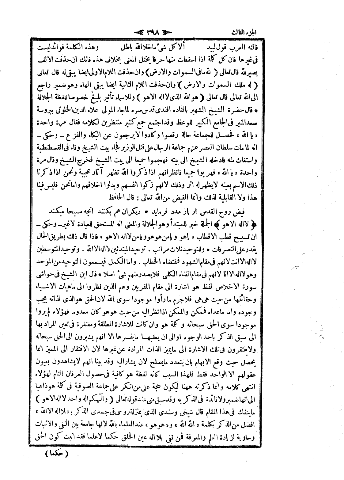 قالته العرب قول لبيد ألا كل شىء ما خلا الله باطل وهذه الكلمة فوائد ليست فى غيرها فان كل كلمة إذا أسقطت منها حرفا يختل المعنى بخلاف هذه فانك ان حذفت الالف يصير لله قال تعالى لِلَّهِ ما فِي السَّماواتِ وَالْأَرْضِ وان حذفت اللام الاولى ايضا يبقى له قال تعالى لَهُ مُلْكُ السَّماواتِ وَالْأَرْضِ وان حذفت اللام الثانية ايضا يبقى الهاء وهو ضمير راجع الى الله تعالى قال تعالى هُوَ اللَّهُ الَّذِي لا إِلهَ إِلَّا هُوَ وللاسماء تأثير بليغ خصوصا للفظة الجلالة قال حضرة الشيخ الشهير بافتاده افندى قدس سره لما جاء المولى علاء الدين الخلوتى ببروسة صعد المنبر في الجامع الكبير للوعظ وقد اجتمع جمع كثير منتظرين لكلامه فقال مرة واحدة «يا الله» فحصل للجماعة حالة رقصوا وكادوا لا يرجعون عن البكاء والفزع- وحكى- انه لما مات سلطان العصر عزم جماعة الرجال على قتل الوزير فجاء بيت الشيخ وفاء في القسطنطنية واستغاث منه فادخله الشيخ الى بيته فهجموا جميعا الى بيت الشيخ فخرج الشيخ وقال مرة واحدة «يا الله» فهربوا جميعا فانظر انهم إذا ذكروا الله تظهر آثار عجيبة ونحن إذا ذكرنا ذلك الاسم بعينه لا يظهر له اثر وذلك لانهم زكوا أنفسهم وبدلوا اخلاقهم واما نحن فليس فينا هذا ولا القابلية لذلك وانما الفيض من الله تعالى: قال الحافظ