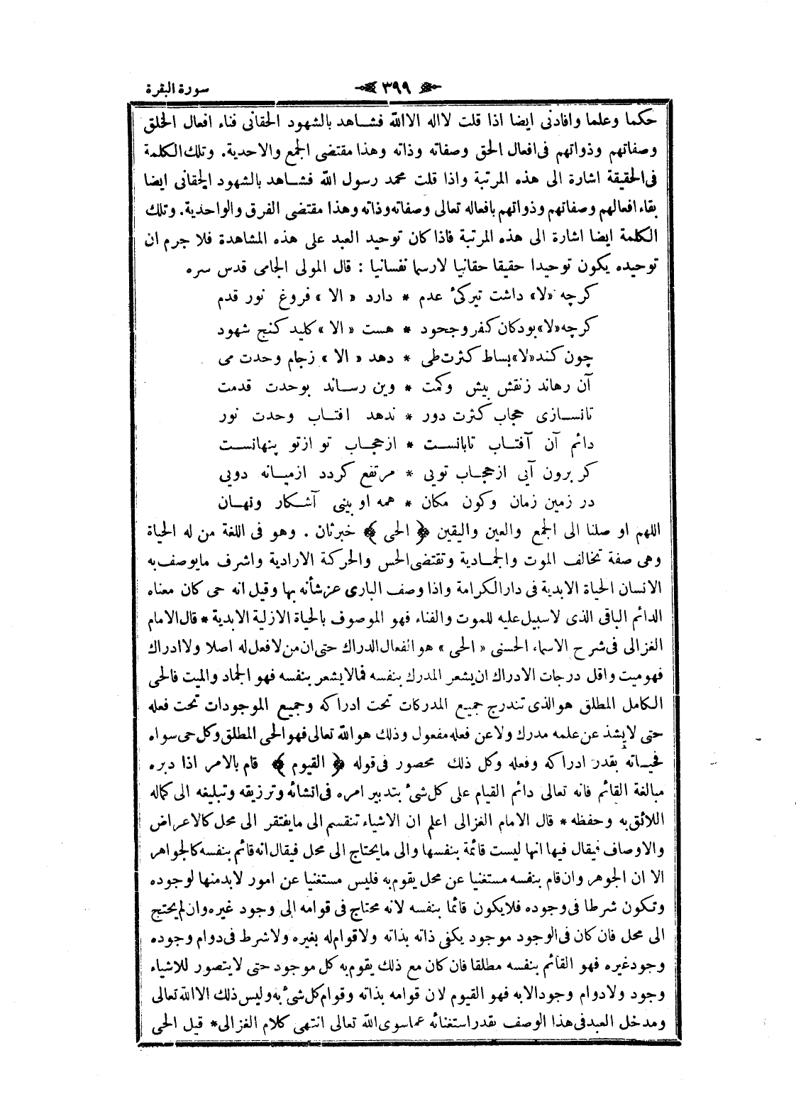 حكما وعلما وأفادني ايضا إذا قلت لا اله الا الله فشاهد بالشهود الحقانى فناء افعال الخلق وصفاتهم وذواتهم في افعال الحق وصفاته وذاته وهذا مقتضى الجمع والاحدية. وتلك الكلمة فى الحقيقة اشارة الى هذه المرتبة وإذا قلت محمد رسول الله فشاهد بالشهود الحقانى ايضا بقاء أفعالهم وصفاتهم وذواتهم بأفعاله تعالى وصفاته وذاته وهذا مقتضى الفرق والواحدية. وتلك الكلمة ايضا اشارة الى هذه المرتبة فاذا كان توحيد العبد على هذه المشاهدة فلا جرم ان توحيده يكون توحيدا حقيقا حقانيا لا رسما نفسانيا: قال المولى الجامى قدس سره كر چهـ «لا» داشت تيركئ عدم دارد «الا» فروع نور قدم كر چهـ «لا» بود كان كفر وجحود هست «الا» كليد كنج شهود چون كند «لا» بساط كثرت طى دهد «الا» ز جام وحدت مى آن رهاند ز نقش بيش وكمت وين رساند بوحدت قدمت تا نسازى حجاب كثرت دور ندهد آفتاب وحدت نور دائم آن آفتاب تابانست از حجاب تو از تو پنهانست كر برون آيى از حجاب تويى مرتفع كردد از ميانه دويى در زمين زمان وكون مكان همه او بينى آشكار ونهان اللهم أوصلنا الى الجمع والعين واليقين الْحَيُّ خبر ثان. وهو في اللغة من له الحياة وهي صفة تخالف الموت والجمادية وتقتضى الحس والحركة الارادية واشرف ما يوصف به الإنسان الحياة الابدية في دار الكرامة وإذا وصف الباري عز شأنه بها وقيل انه حى كان معناه الدائم الباقي الذي لا سبيل عليه للموت والفناء فهو الموصوف بالحياة الازلية الابدية قال الامام الغزالي في شرح الأسماء الحسنى «الحي» هو الفعال الدراك حتى ان من لا فعل له أصلا ولا ادراك فهو ميت واقل درجات الإدراك ان يشعر المدرك بنفسه فما لا يشعر بنفسه فهو الجماد والميت فالحى الكامل المطلق هو الذي تندرج جميع المدركات تحت إدراكه وجميع الموجودات تحت فعله حتى لا يشد عن علمه مدرك ولا عن فعله مفعول وذلك هو الله تعالى فهو الحي المطلق وكل حى سواه فحياته بقدر إدراكه وفعله وكل ذلك محصور في قوله الْقَيُّومُ قام بالأمر إذا دبره مبالغة القائم فانه تعالى دائم القيام على كل شىء بتدبير امره في إنشائه وترزيقه وتبليغه الى كماله اللائق به وحفظه قال الامام الغزالي اعلم ان الأشياء تنقسم الى ما يفتقر الى محل كالاعراض والأوصاف فيقال فيها انها ليست قائمة بنفسها والى ما يحتاج الى محل فيقال انه قائم بنفسه كالجواهر الا ان الجوهر وان قام بنفسه مستغنيا عن محل يقوم به فليس مستغنيا عن امور لا بد منها لوجوده وتكون شرطا في وجوده فلا يكون قائما بنفسه لانه محتاج في قوامه الى وجود غيره وان لم يحتج الى محل فان كان في الوجود موجود يكفى ذاته بذاته ولا قوام له بغيره ولا شرط في دوام وجوده وجود غيره فهو القائم بنفسه مطلقا فان كان مع ذلك يقوم به كل موجود حتى لا يتصور للاشياء وجود ولا دوام وجود الا به فهو القيوم لان قوامه بذاته وقوام كل شىء به وليس ذلك الا الله تعالى ومدخل العبد في هذا الوصف بقدر استغنائه عما سوى الله تعالى انتهى كلام الغزالي قيل الحي