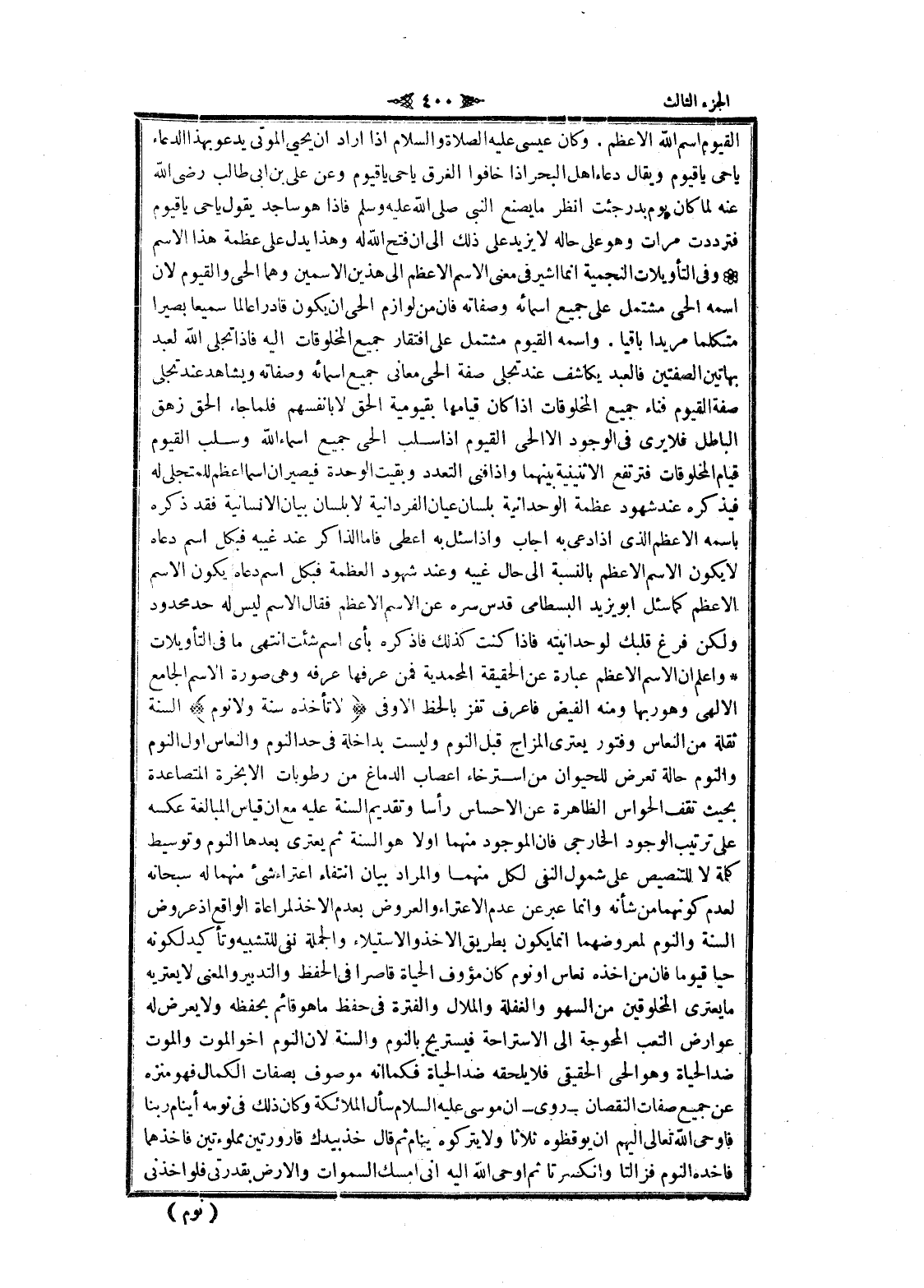 اليه فاذا تجلى الله لعبد بهاتين الصفتين فالعبد يكاشف عند تجلى صفة الحي معانى جميع أسمائه وصفاته ويشاهد عند تجلى صفة القيوم فناء جميع المخلوقات إذا كان قيامها بقيومية الحق لا بانفسهم فلما جاء الحق زهق الباطل فلا يرى في الوجود الا الحي القيوم إذا سلب الحي جميع اسماء الله وسلب القيوم قيام المخلوقات فترتفع الاثنينية بينهما وإذا فنى التعدد وبقيت الوحدة فيصيران اسما أعظم للمتجلى له فيذكره عند شهود عظمة الوحدانية بلسان عيان الفردانية لا بلسان بيان الانسانية فقد ذكره باسمه الأعظم الذي إذا دعى به أجاب وإذا سئل به اعطى فاما الذاكر عند غيبه فكل اسم دعاه لا يكون الاسم الأعظم بالنسبة الى حال غيبه وعند شهود العظمة فبكل اسم دعاه يكون الاسم الأعظم كما سئل ابو يزيد البسطامي قدس سره عن الاسم الأعظم فقال الاسم ليس له حد محدود ولكن فرغ قلبك لوحدانيته فاذا كنت كذلك فاذكره بأى اسم شئت انتهى ما في التأويلات واعلم ان الاسم الأعظم عبارة عن الحقيقة المحمدية فمن عرفها عرفه وهي صورة الاسم الجامع الإلهي وهو ربها ومنه الفيض فاعرف تفز بالحظ الاوفى لا تَأْخُذُهُ سِنَةٌ وَلا نَوْمٌ السنة ثقلة من النعاس وفتور يعترى المزاج قبل النوم وليست بداخلة في حد النوم والنعاس أول النوم والنوم حالة تعرض للحيوان من استرخاء اعصاب الدماغ من رطوبات الابخرة المتصاعدة بحيث تقف الحواس الظاهرة عن الاحساس رأسا وتقديم السنة عليه مع ان قياس المبالغة عكسه على ترتيب الوجود الخارجي فان الموجود منهما اولا هو السنة ثم يعترى بعدها النوم وتوسيط كلمة لا للتنصيص على شمول النفي لكل منهما والمراد بيان انتفاء اعتراء شىء منهما له سبحانه لعدم كونهما من شأنه وانما عبر عن عدم الاعتراء والعروض بعدم الاخذ لمراعاة الواقع إذ عروض السنة والنوم لمعروضهما انما يكون بطريق الاخذ والاستيلاء والجملة نفى للتشبيه وتأكيد لكونه حيا قيوما فان من اخذه نعاس او نوم كان مؤوف الحياة قاصرا في الحفظ والتدبير والمعنى لا يعتريه ما يعترى المخلوقين من السهو والغفلة والملال والفترة في حفظ ما هو قائم بحفظه ولا يعرض له عوارض التعب المحوجة الى الاستراحة فيستريح بالنوم والسنة لان النوم أخو الموت والموت ضد الحياة وهو الحي الحقيقي فلا يلحقه ضد الحياة فكما انه موصوف بصفات الكمال فهو منزه عن جميع صفات النقصان- روى- ان موسى عليه السلام سأل الملائكة وكان ذلك في نومه أينام ربنا فاوحى الله تعالى إليهم ان يوقظوه ثلاثا ولا يتركوه ينام ثم قال خذ بيدك قارورتين مملوءتين فاخذهما فاخذه النوم فزالتا وانكسرتا ثم اوحى الله اليه انى امسك السموات والأرض بقدرتي فلو أخذني