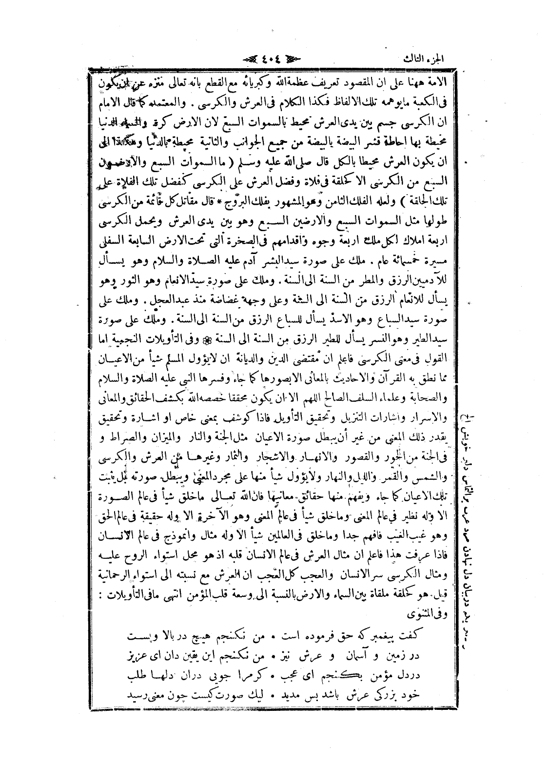 الامة هاهنا على ان المقصود تعريف عظمة الله وكبريائه مع القطع بانه تعالى منزه عن ان يكون فى الكعبة ما يوهمه تلك الألفاظ فكذا الكلام في العرش والكرسي. والمعتمد كما قال الامام ان الكرسي جسم بين يدى العرش محيط بالسماوات السبع لان الأرض كرة والسماء الدنيا محيطة بها احاطة قشر البيضة بالبيضة من جميع الجوانب والثانية محيطة بالدنيا وهكذا الى ان يكون العرش محيطا بالكل قال صلى الله عليه وسلم (ما السموات السبع والأرضون السبع من الكرسي الا كحلقة في فلاة وفضل العرش على الكرسي كفضل تلك الفلاة على تلك الحلقة) ولعله الفلك الثامن وهو المشهور بفلك البروج قال مقاتل كل قائمة من الكرسي طولها مثل السموات السبع والأرضين السبع وهو بين يدى العرش ويحمل الكرسي اربعة املاك لكل ملك اربعة وجوه وأقدامهم في الصخرة التي تحت الأرض السابعة السفلى مسيرة خمسمائة عام. ملك على صورة سيد البشر آدم عليه الصلاة والسلام وهو يسأل للآدميين الرزق والمطر من السنة الى السنة. وملك على صورة سيد الانعام وهو الثور وهو يسأل للانعام الرزق من السنة الى السنة وعلى وجهه غضاضة منذ عبد العجل. وملك على صورة سيد السباع وهو الأسد يسأل للسباع الرزق من السنة الى السنة. وملك على صورة سيد الطير وهو النسر يسأل للطير الرزق من السنة الى السنة وفي التأويلات النجمية اما القول في معنى الكرسي فاعلم ان مقتضى الدين والديانة ان لا يؤول المسلم شيأ من الأعيان مما نطق به القرآن والأحاديث بالمعاني الا بصورها كما جاء وفسرها النبي عليه الصلاة والسلام والصحابة وعلماء السلف الصالح اللهم الا ان يكون محققا خصصه الله بكشف الحقائق والمعاني والاسرار وإشارات التنزيل وتحقيق التأويل فاذا كوشف بمعنى خاص او اشارة وتحقيق يقدر ذلك المعنى من غير أن يبطل صورة الأعيان مثل الجنة والنار والميزان والصراط وفى الجنة من الحور والقصور والأنهار والأشجار والثمار وغيرها من العرش والكرسي والشمس والقمر والليل والنهار ولا يؤول شيأ منها على مجرد المعنى ويبطل صورته بل يثبت تلك الأعيان كما جاء ويفهم منها حقائق معانيها فان الله تعالى ما خلق شيأ في عالم الصورة الا وله نظير في عالم المعنى وما خلق شيأ في عالم المعنى وهو الآخرة الا وله حقيقة في عالم الحق وهو غيب الغيب فافهم جدا وما خلق في العالمين شيأ الا وله مثال وأنموذج في عالم الإنسان فاذا عرفت هذا فاعلم ان مثال العرش في عالم الإنسان قلبه إذ هو محل استواء الروح عليه ومثال الكرسي سر الإنسان والعجب كل العجب ان العرش مع نسبته الى استواء الرحمانية قيل هو كحلقة ملقاة بين السماء والأرض بالنسبة الى وسعة قلب المؤمن انتهى ما في التأويلات:
