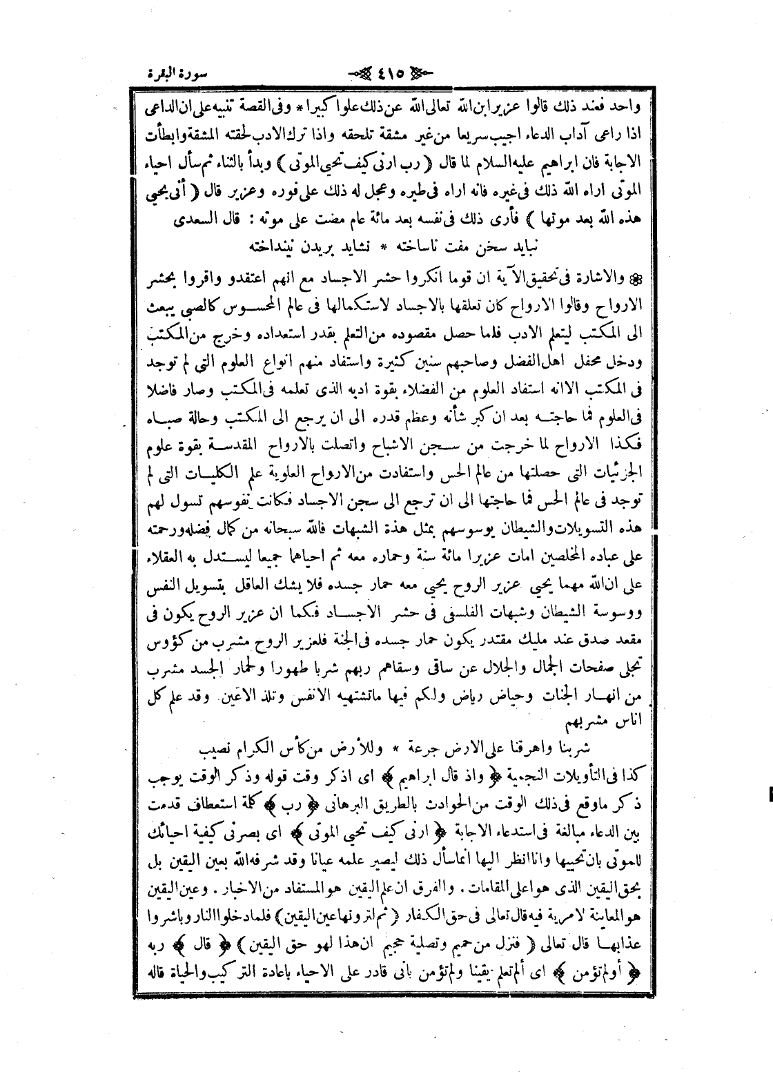 والاشارة في تحقيق الآية ان قوما أنكروا حشر الأجساد مع انهم اعتقدوا وأقروا بحشر الأرواح وقالوا الأرواح كان تعلقها بالأجساد لاستكمالها في عالم المحسوس كالصبى يبعث الى المكتب ليتعلم الأدب فلما حصل مقصوده من التعلم بقدر استعداده وحرج من المكتب ودخل محفل اهل الفضل وصاحبهم سنين كثيرة واستفاد منهم انواع العلوم التي لم توجد فى المكتب الا انه استفاد العلوم من الفضلاء بقوة أدبه الذي تعلمه في المكتب وصار فاضلا فى العلوم فما حاجته بعد ان كبر شأنه وعظم قدره الى ان يرجع الى المكتب وحالة صباه فكذا الأرواح لما خرجت من سجن الأشباح واتصلت بالأرواح المقدسة بقوة علوم الجزئيات التي حصلتها من عالم الحس واستفادت من الأرواح العلوية علم الكليات التي لم توجد في عالم الحس فما حاجتها الى ان ترجع الى سجن الأجساد فكانت نفوسهم تسول لهم هذه التسويلات والشيطان يوسوسهم بمثل هذة الشبهات فالله سبحانه من كمال فضله ورحمته على عباده المخلصين أمات عزيرا مائة سنة وحماره معه ثم احياهما جميعا ليستدل به العقلاء على ان الله مهما يحيى عزير الروح يحيى معه حمار جسده فلا يشك العاقل بتسويل النفس ووسوسة الشيطان وشبهات الفلسفي في حشر الأجساد فكما ان عزير الروح يكون في مقعد صدق عند مليك مقتدر يكون حمار جسده في الجنة فلعزير الروح مشرب من كؤوس تجلى صفحات الجمال والجلال عن ساقى وسقاهم ربهم شربا طهورا ولحمار الجسد مشرب من انهار الجنات وحياض رياض ولكم فيها ما تشتهيه الأنفس وتلذ الأعين وقد علم كل أناس مشربهم