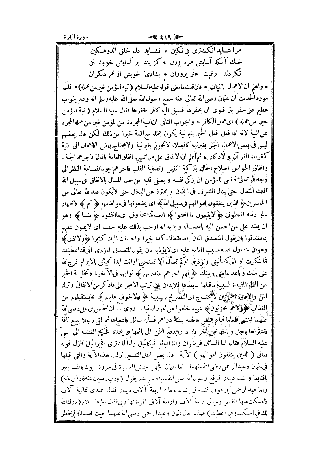 واعلم ان الأعمال بالنيات فان قلت ما معنى قوله عليه السلام (نية المؤمن خير من عمله) قلت مورد الحديث ان عثمان رضى الله تعالى عنه سمع رسول الله صلى الله عليه وسلم انه وعد بثواب عظيم على حفر بئر فنوى ان يحفرها فسبق اليه كافر فحفرها فقال عليه السلام (نية المؤمن خير من عمله) اى عمل الكافر والجواب الثاني ان النية المجردة من المؤمن خير من عمله المجرد عن النية لانه إذا فعل فعل الخير بغير نية يكون عمله مع النية خيرا من ذلك لكن قال بعضهم ليس في بعض الأعمال اجر بغير نية كالصلاة لا تجوز بغير نية ولا يحتاج بعض الأعمال الى النية كقراءة القرآن والاذكار ثم اعلم ان الانفاق على مراتب. انفاق العامة بالمال فاجرهم الجنة.
