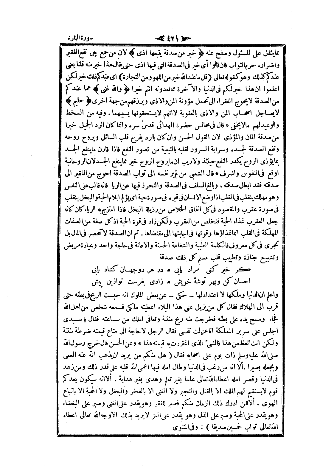 مما يثقل على المسئول وصفح عنه خَيْرٌ مِنْ صَدَقَةٍ يَتْبَعُها أَذىً لان من جمع بين نفع الفقير واضراره حرم الثواب فان قالوا أي خير في الصدقة التي فيها أذى حتى يقال هذا خير منه قلنا يعنى عندكم كذلك وهو كقوله تعالى قُلْ ما عِنْدَ اللَّهِ خَيْرٌ مِنَ اللَّهْوِ وَمِنَ التِّجارَةِ اى عندكم ذلك خير لكم اعلموا ان هذا خير لكم في الدنيا والآخرة مما تعدونه أنتم خيرا وَاللَّهُ غَنِيٌّ عما عندكم من الصدقة لا يحوج الفقراء الى تحمل مؤونة المن والأذى ويرزقهم من جهة اخرى حَلِيمٌ لا يعاجل اصحاب المن والأذى بالعقوبة لا انهم لا يستحقونها بسببهما. وفيه من السخط والوعيد لهم ما لا يخفى قال في مجالس حضرة الهدائى قدس سره وانما كان الرد الجميل خيرا من صدقة المان والمؤذى لان القول الحسن وان كان بالرد يفرح قلب السائل ويروح روحه ونفع الصدقة لجسده وسراية السرور لقلبه بالتبعية من تصور النفع فاذا قارن ما ينفع الجسد بما يؤذى الروح يكدر النفع حينئذ ولا ريب ان ما يروح الروح خير مما ينفع الجسد لان الروحانية أوقع في النفوس واشرف قال الشعبي من لم ير نفسه الى ثواب الصدقة أحوج من الفقير الى صدقته فقد أبطل صدقته. وبالغ السلف في الصدقة والتحرز فيها عن الريا فانه غالب على النفس وهو مهلك ينقلب في القلب إذا وضع الإنسان في قبره في صورة حية اى يؤلم إيلام الحية والبخل ينقلب فى صورة عقرب والمقصود في كل انفاق الخلاص من رذيلة البخل فاذا امتزج به الرياء كان كانه جعل العقرب غذاء الحية فتخلص من العقرب ولكن زاد في قوة الحية إذ كل صفة من الصفات المهلكة في القلب انما غذاؤها وقوتها في إجابتها الى مقتضاها. ثم ان الصدقة لا تنحصر في المال بل تجرى في كل معروف فالكلمة الطيبة والشفاعة الحسنة والاعانة في حاجة واحد وعيادة مريض وتشييع جنازة وتطييب قلب مسلم كل ذلك صدقة