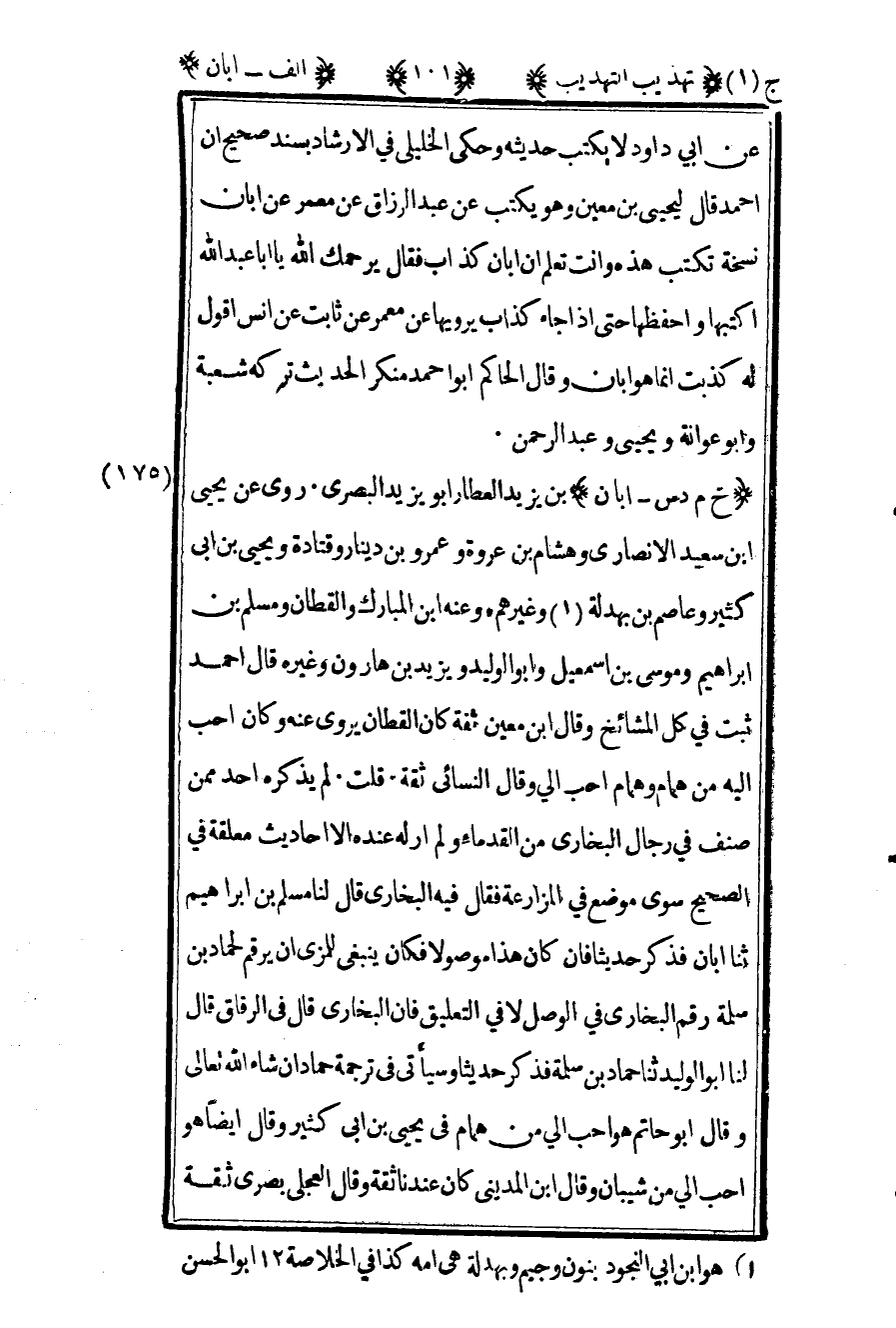 175 ـ "خ م د س - أبان" بن يزيد العطار أبو يزيد البصري. روى عن يحيى بن سعيد الأنصاري وهشام ابن عروة وعمرو بن دينار, وقتادة ويحيى بن أبي كثير وعاصم بن بهدلة1 وغيرهم, وعنه ابن المبارك والقطان ومسلم بن إبراهيم وموسى بن إسماعيل وأبو الوليد ويزيد بن هارون وغيره. قال أحمد: "ثبت في كل المشائخ", وقال بن معين: "ثقة كان القطان يروي عنه وكان أحب إليه من همام, وهمام أحب إلي", وقال النسائي: "ثقة". قلت: لم يذكره أحد ممن صنف في رجال البخاري من القدماء, ولم أر له عنده إلا أحاديث معلقة في "الصحيح" سوى موضع في المزارعة, فقال فيه البخاري: قال لنا مسلم بن إبراهيم ثنا أبان فذكر حديثا, فإن كان هذا موصولا فكان ينبغي للمزي أن يرقم لحماد بن سلمة رقم البخاري في الوصل لا في التعليق, فإن البخاري قال في "الرقاق" قال لنا أبو الوليد ثنا حماد بن سلمة فذكر حديثا وسيأتي في ترجمة حماد -إن شاء الله تعالى-, وقال أبو حاتم: "هو أحب إلي من همام في ويحيى بن أبي كثير", وقال أيضا: "هو أحب إلي من شيبان", وقال ابن المديني: "كان عندنا ثقة", وقال العجلي: "بصري ثقة,