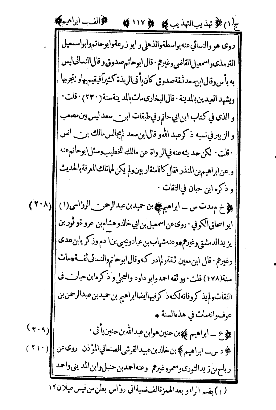 208 ـ "خ م مد ت س- إبراهيم" بن حميد بن عبد الرحمن الرؤاسي1 أبو إسحاق الكوفي. روى عن إسماعيل بن أبي خالد وهشام بن عروة وثور بن يزيد الدمشقي وغيرهم. وعنه شهاب بن عباد ويحيى بن آدم وزكريا بن عدي وغيرهم. قال ابن معين: "ثقة ولم أدركه", وقال أبو حاتم والنسائي: "ثقة مات سنة "178"". قلت: ووثقه أحمد وأبو داود والعجلي وذكره بن حبان في الثقات ولم يذكر وفاته, لكنه ذكر فيها أيضا إبراهيم بن حميد بن عبد الرحمن بن عوف وأنه مات في هذه السنة.