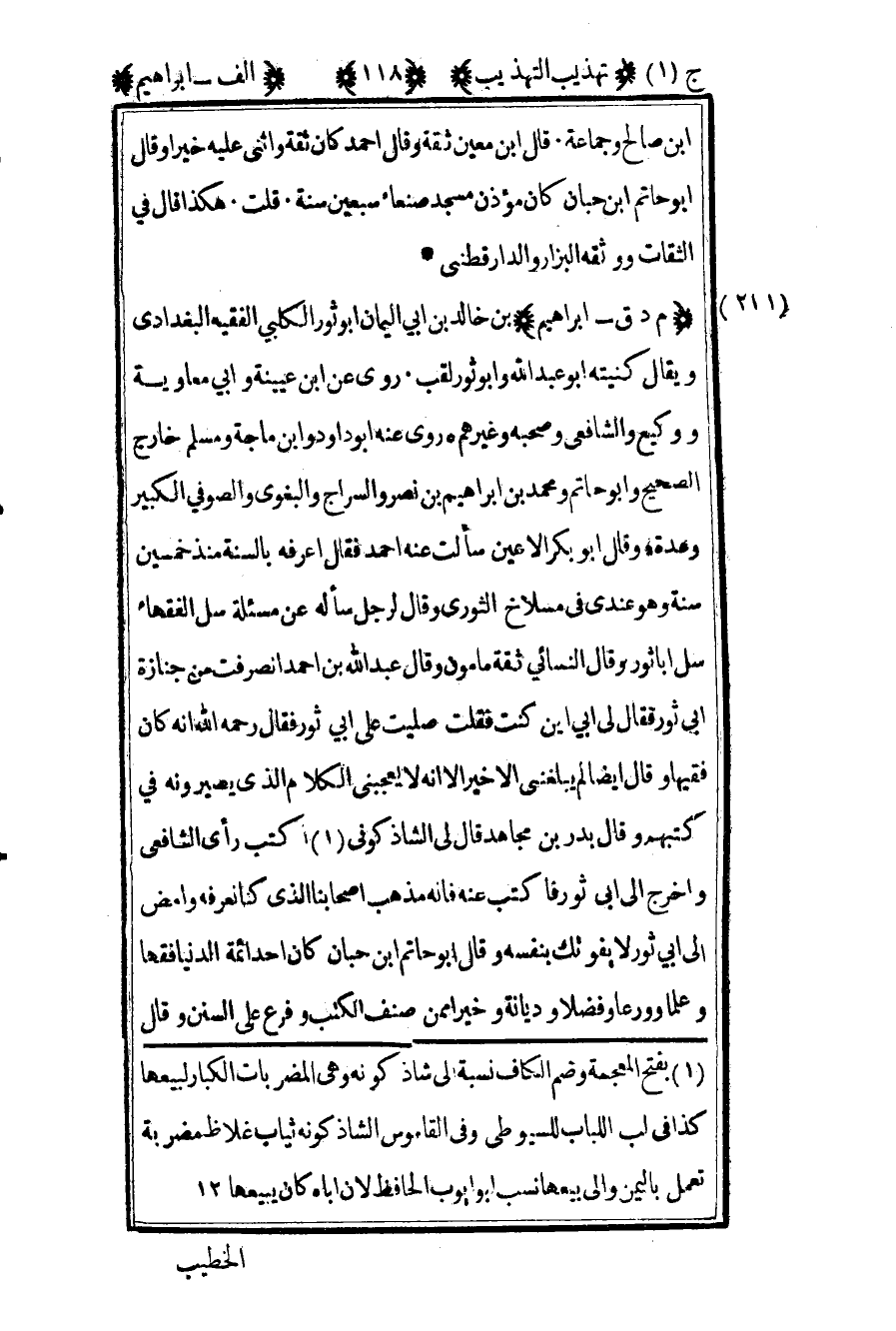 211 ـ "م د ق إبراهيم" بن خالد بن أبي اليمان أبو ثور الكلبي الفقيه البغدادي, ويقال كنيته أبو عبد الله وأبو ثور لقب. روى عن ابن عيينة وأبي معاوية ووكيع والشافعي وصحبه وغيرهم. روى عنه أبو داود وابن ماجة ومسلم خارج الصحيح, وأبو حاتم ومحمد بن إبراهيم بن نصر والسراج والبغوي والصوفي الكبير وعدة. وقال أبو بكر الأعين سألت عنه أحمد فقال: "أعرفه بالسنة منذ خمسين سنة وهو عندي في مسلاخ الثوري", وقال لرجل سأله عن مسألة: "سل الفقهاء سل أبا ثور", وقال النسائي: "ثقة مأمون", وقال عبد الله بن أحمد: "انصرفت من جنازة أبي ثور فقال لي أبي: أين كنت؟ فقلت: صليت على أبي ثور فقال -رحمه الله- إنه كان فقيها", وقال أيضا: "لم يبلغني إلا خيرا إلا أنه لا يعجبني الكلام الذي يصيرونه في كتبهم", وقال بدر بن مجاهد قال لي الشاذكوني1 اكتب رأي الشافعي وأخرج إلى أبي ثور فأكتب عنه فإنه مذهب أصحابنا الذي كنا نعرفه وامض إلى أبي ثور لا يفوتك بنفسه, وقال أبو حاتم بن حبان: "كان أحد أئمة الدنيا فقها وعلما وورعا وفضلا وديانة وخيرا ممن صنف الكتب وفرع على السنن", وقال
