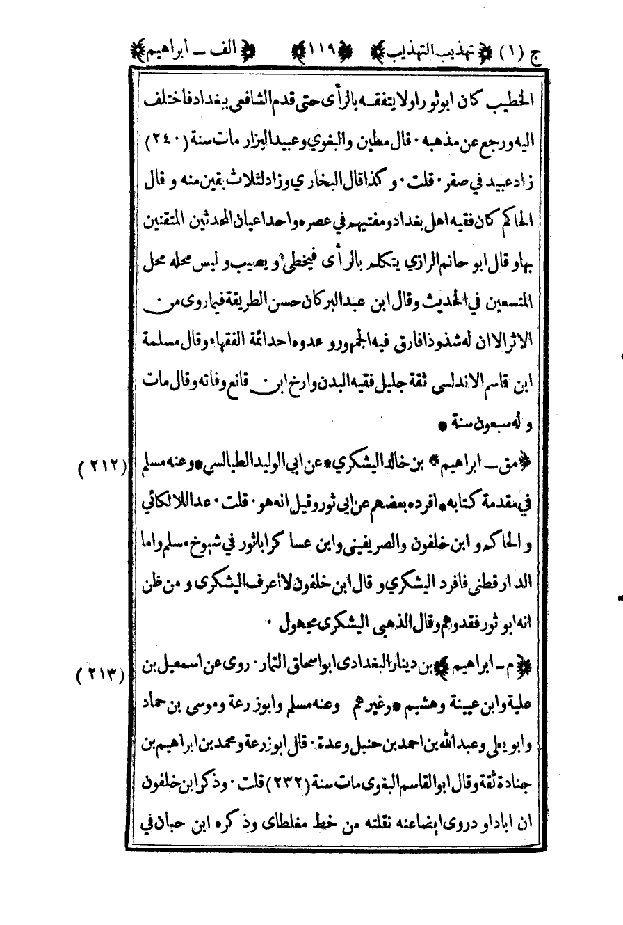 212 ـ "مق - إبراهيم" بن خالد اليشكريز روى عن أبي الوليد الطيالسي وعنه مسلم في مقدمة كتابه, أفرده بعضهم عن أبي ثور وقيل أنه هو. قلت: عد اللالكائي والحاكم وابن خلفون والصريفينى وابن عساكر: "أبا ثور في شيوخ مسلم", وأما الدارقطني: فأفرد اليشكري, وقال بن خلفون: "لا أعرف اليشكري ومن ظن أنه أبو ثور فقد وهم", وقال الذهبي: "اليشكري مجهول".